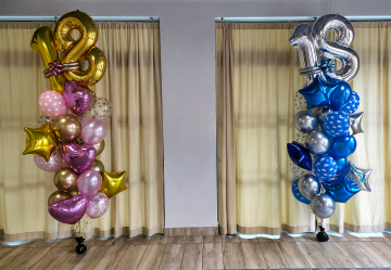 Balony z helem wykorzystaliśmy do dekoracji na podwójnej imprezie urodzinowej. Głównym elementem instalacji były dwa duże bukiety. Oba wykonane z różnego rodzaju balonów napełnionych helem. Pierwszy w odcieniach różu i złota przygotowaliśmy dla dziewczyny/kobiety. Drugi niebiesko-srebrny ułożony został z myślą o chłopcu/mężczyźnie. Razem stanowiły spójny i wyrazisty element dekoracyjny. Przygotowaliśmy też stroiki w tych samych odcieniach które stanęły na stołach. Dopełnieniem dekoracji były balony z helem które zostały puszczone luźno pod sufitem sali. Jak wam się podobają dekoracje tego typu – nazbyt minimalistyczne czy w sam raz? Jeśli przemawiają i chcielibyście zobaczyć je na swoich imprezach zapraszamy do kontaktu z nami – biuro@gaudeo.pl.