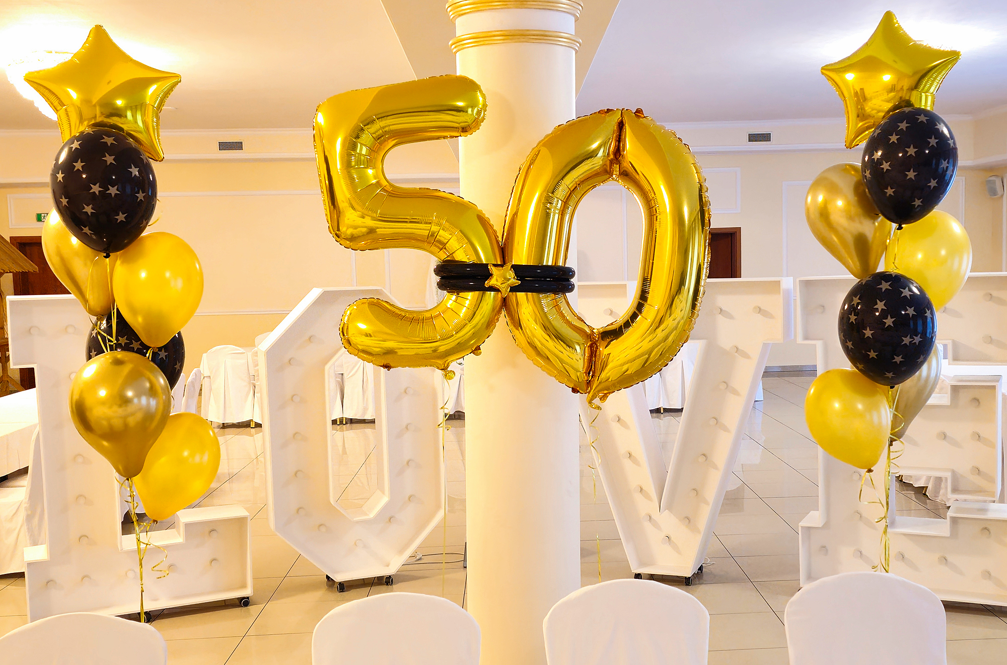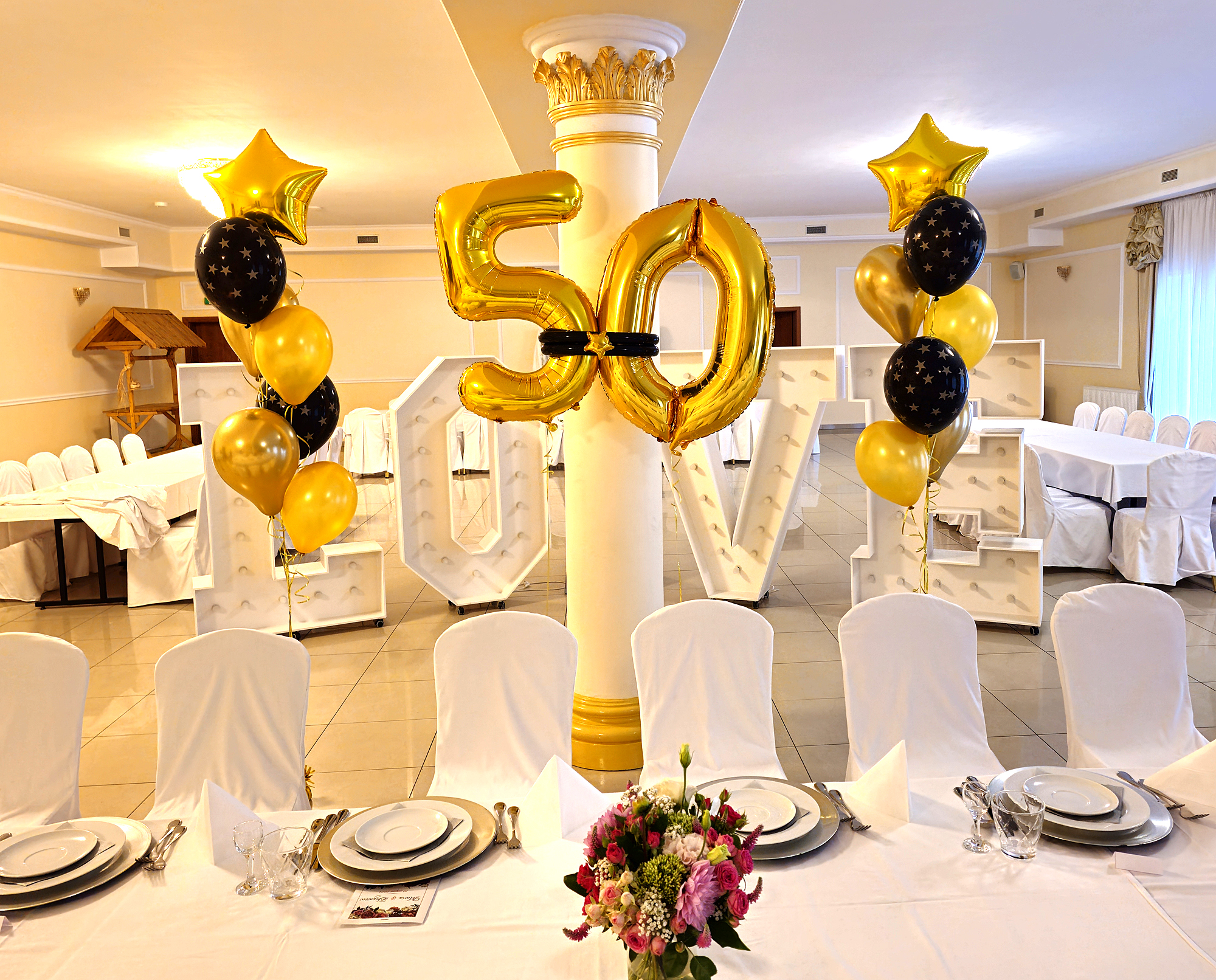 Balony z helem w bukietach dostarczyliśmy na 50 rocznicę Ślubu. Ten piękny Jubileusz wymaga specjalnej oprawy. Najważniejsze były balony w kształcie liczby 50 które podkreśliły charakter imprezy. Do tego dwa stojące po bokach stroiki helowe dopełniające balony liczby. Całość w skromny ale gustowny sposób podkreśliła miejsca jubilatów. Jeśli również planujecie uroczystość rodzinną i chcielibyście uświetnić ją dekoracjami z balonów to zapraszamy do kontaktu z nami – 692404926.
