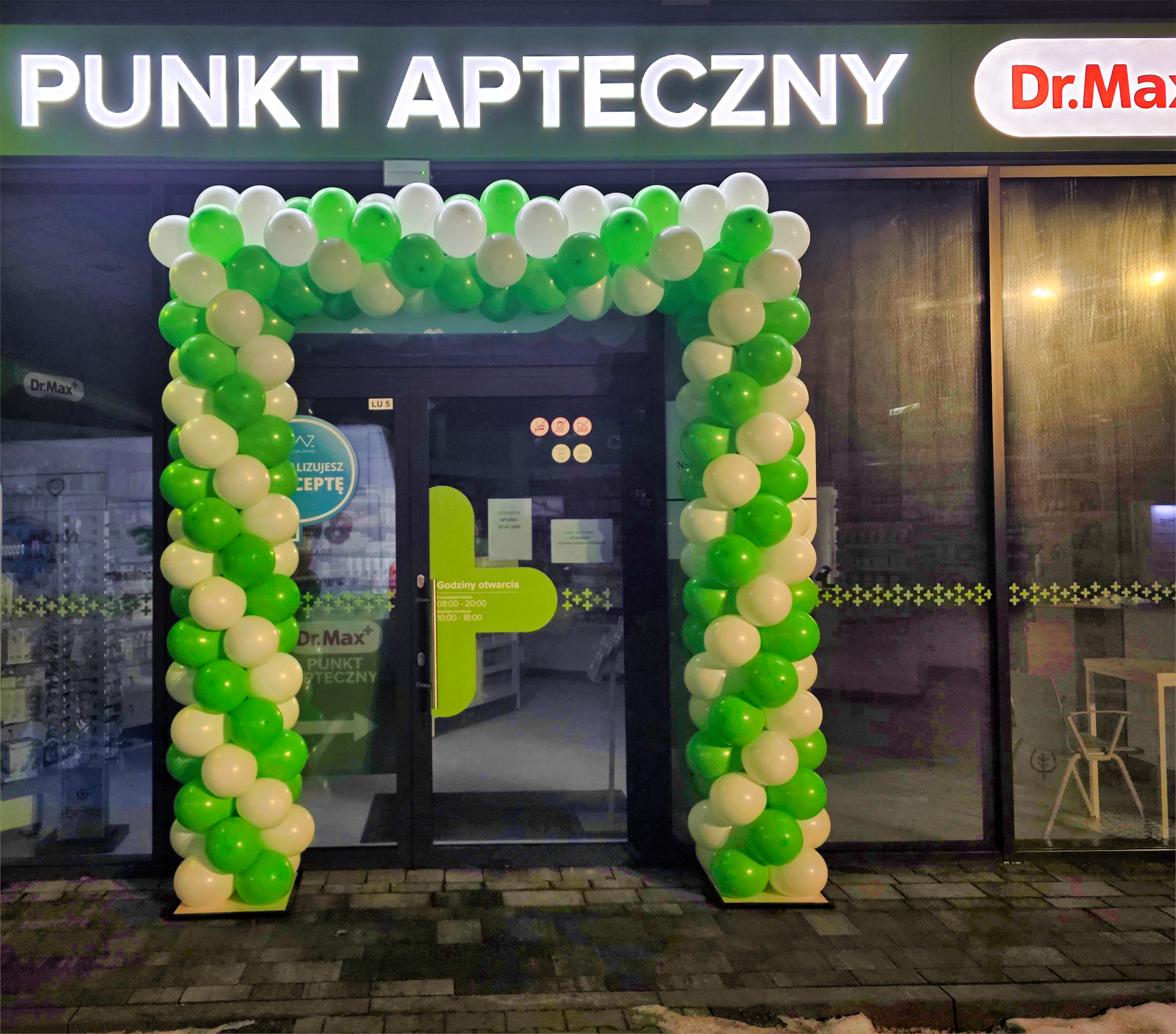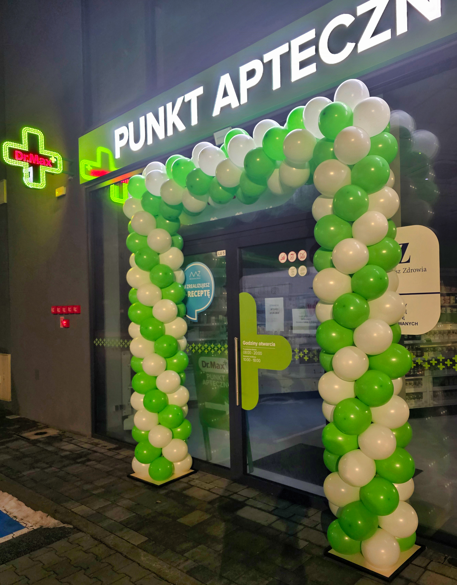 Bramę z balonów zamontowaliśmy w Jaroszowicach koło Wadowic. To instalacja z okazji otwarcia nowego Punktu Aptecznego sieci DrMax. Biało-zielone balony nawiązujące do barw tej grupy ułożyliśmy spiralnie na dopasowanym do wejścia stelażu. Następnie przymocowaliśmy go do elementów elewacji tak aby stał stabilnie nawet przy podmuchach wiatru. Dzięki takiemu podkreśleniu apteka z pewnością zwróci na siebie uwagę potencjalnych klientów. Jeśli również planujecie otwarcie lub promocję i chcielibyście zwiększyć ruch to zapraszamy do kontaktu z nami: 692404926.