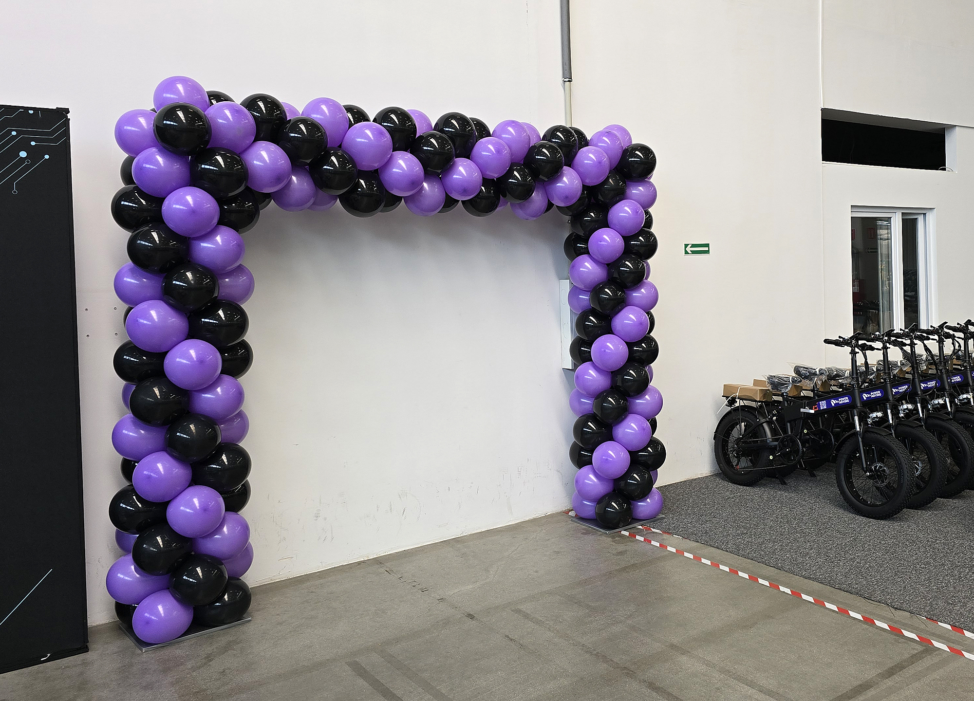Brama z balonów jako dekoracja na otwarcie fabryki rowerów elektrycznych