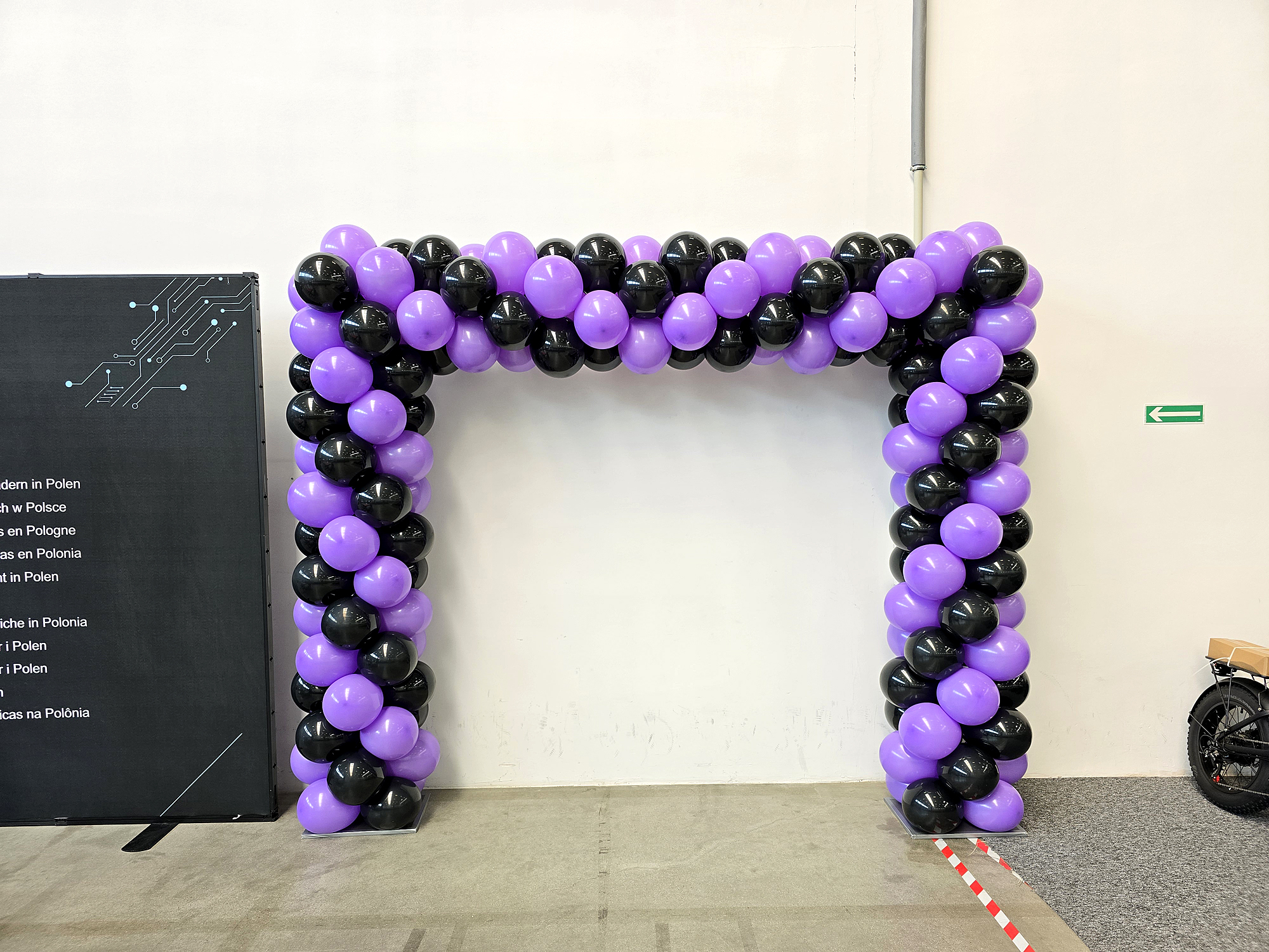 Bramę z balonów zamontowaliśmy w nowo otwieranym zakładzie produkującym rowery elektryczne. Miała ona podkreślać miejsce do robienia pamiątkowych zdjęć. Kolory dekoracji dopasowane zostały do barw firmowych. Połączenie fioletowego z czarnym dało ciekawy efekt wizualny. To dość nietypowe wykorzystanie bramy z balonów ale jak przekonujemy Was od dawna balony zawsze są dobrym dodatkiem na każdym otwarciu. Jeśli chcielibyście zobaczyć je także u siebie w formie bramy czy np. balonów z helem to zapraszamy do kontaktu z nami: biuro@gaudeo.pl.