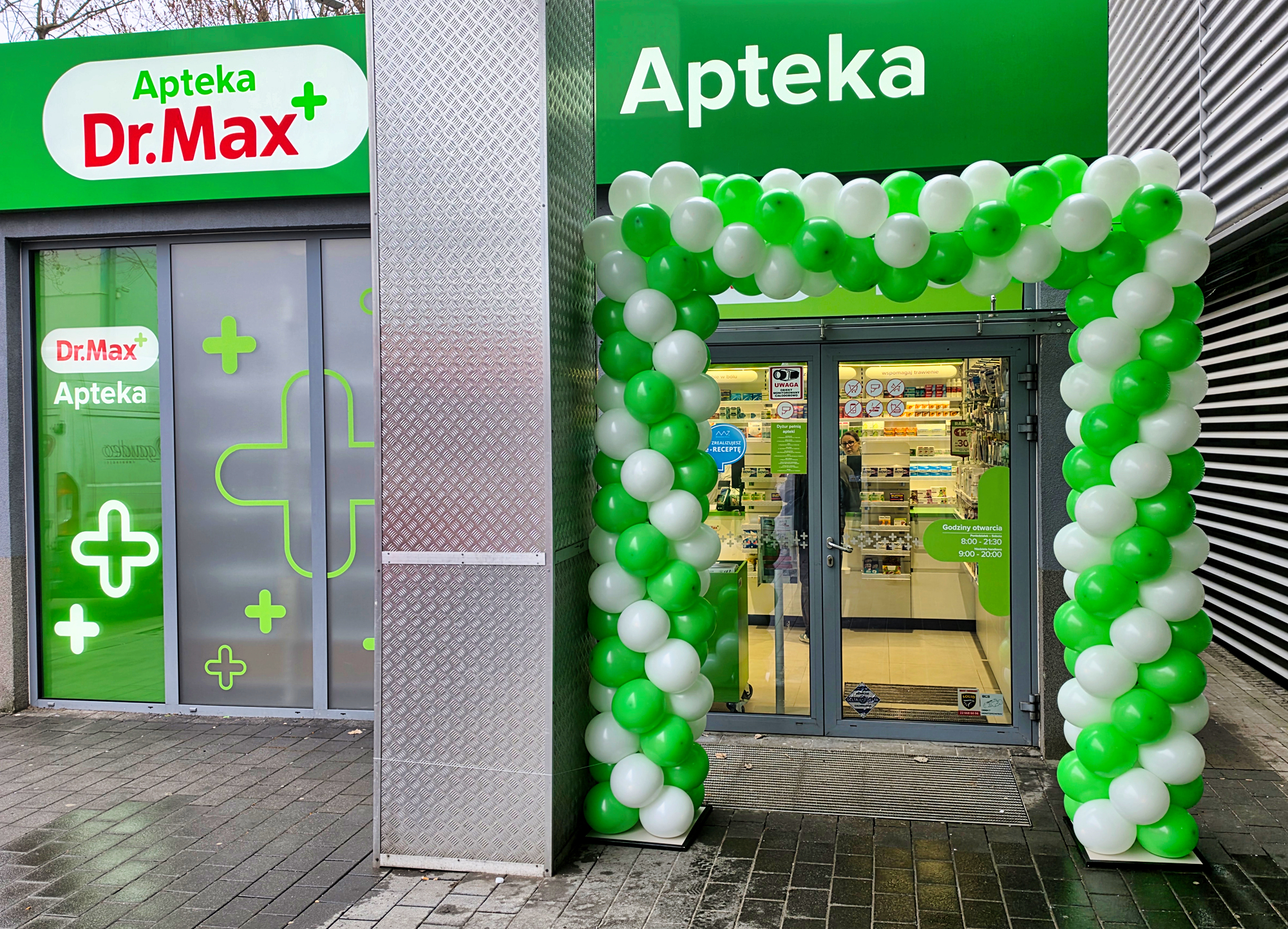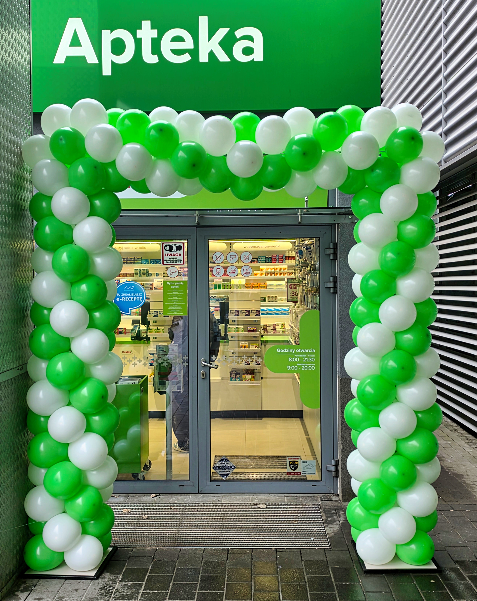 Zielono-białą bramę z balonów zamontowaliśmy dzisiaj na ulicy Bardzkiej we Wrocławiu. To dekoracja z okazji otwarcia po remoncie apteki DrMax. Brama z balonów to świetny pomysł na przyciągnięcie uwagi klientów. Sprawdzi się zdecydowanie bardziej niż kartka na szybie z terminem otwarcia. Dzięki balonom lokal już z daleka zwraca na siebie uwagę. Jeśli również chcecie skorzystać z tej balonowej magii to zapraszamy do kontaktu – biuro@gaudeo.pl.