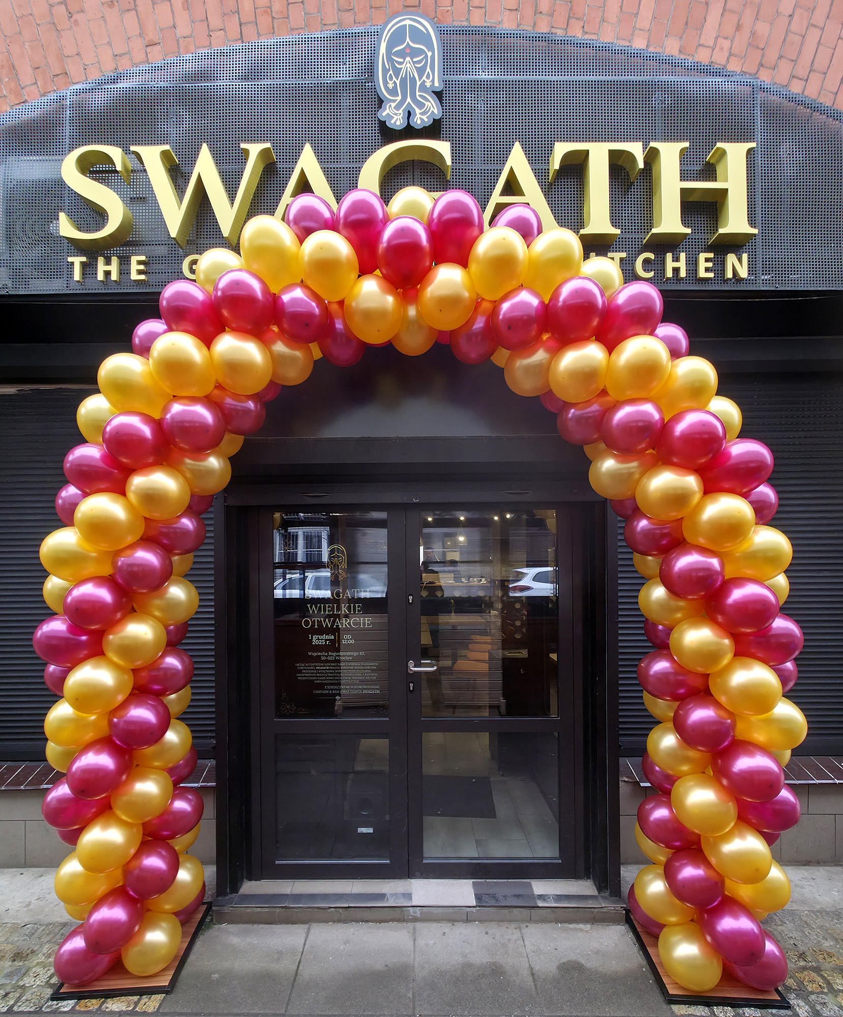 Bramę balonową w kształcie łuku zamontowaliśmy na ulicy Bogusławskiego we Wrocławiu. To dekoracja z okazji otwarcia nowej restauracji z kuchnią indyjską. Do przygotowania dekoracji użyliśmy balonów w kolorze złotym i bordowym. Jeśli więc wypatrzycie na ulicy te kolory balonów to znak że możecie zaspokoić głód. Balony to najlepszy sposób poinformowanie przechodniów że już działacie i zapraszacie do odwiedzenia lokalu – wykorzystajcie go!- dzwońcie i zamawiajcie 692404926.