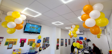 Dekorację balonową wykonaliśmy we Wrocławiu na ulicy Strzegomskiej. Przed wejściem do lokalu zamontowaliśmy kolumny z balonów. Ułożone zostały w biało-pomarańczowo-żółtej kolorystyce nawiązującej do kolorów tej firmy. Wewnątrz lokalu przygotowaliśmy sople z balonów w tych samych barwach. Sople to po prostu krótkie girlandy balonowe zamontowane pod sufitem lokalu. Jak Wam się podoba taka energetyczna dekoracja? Zwróciła Waszą uwagę? Chcielibyście mieć taką u siebie? Jeśli tak zapraszamy do kontaktu z naszą ekipą – tel. 692404926.