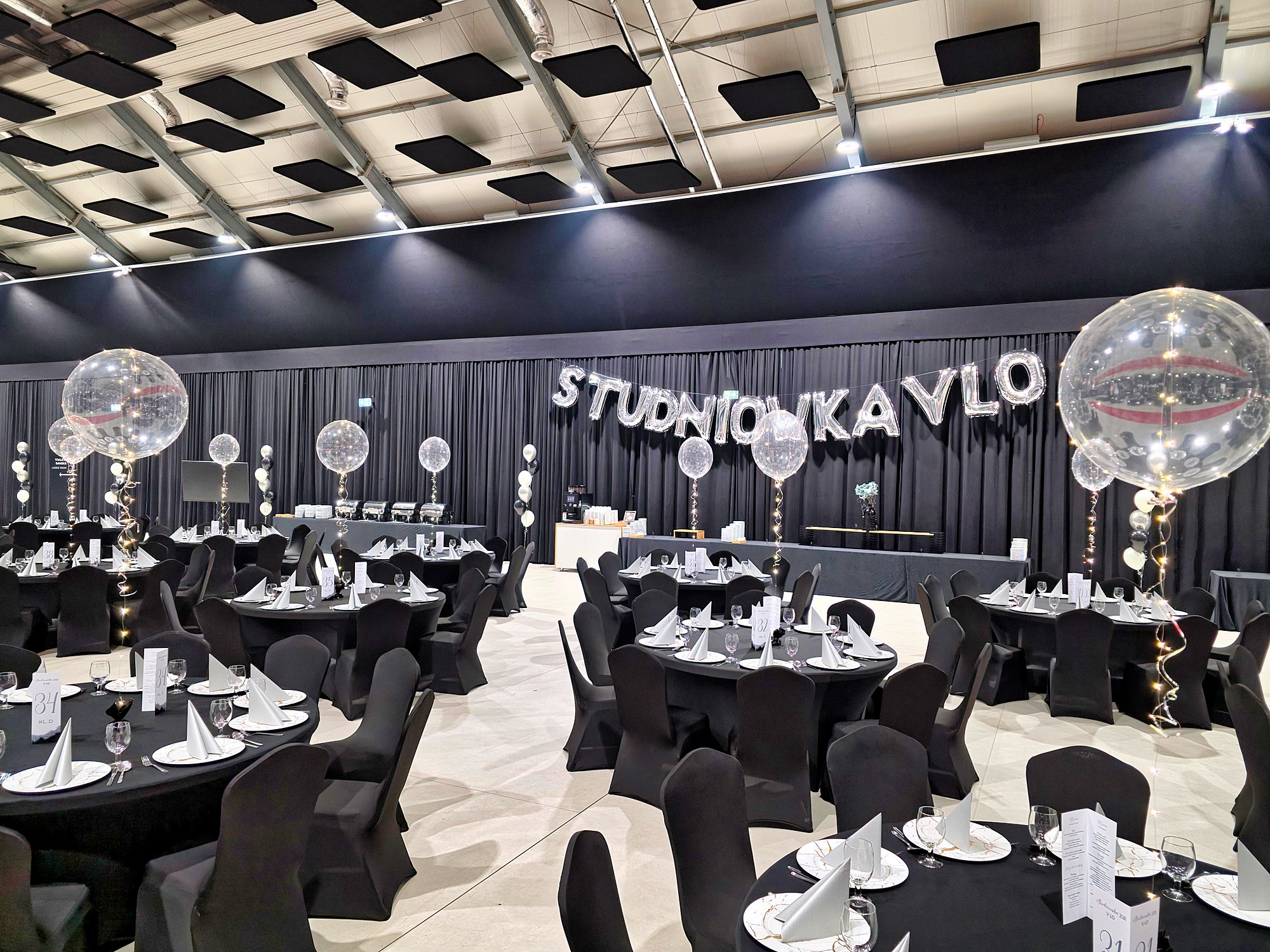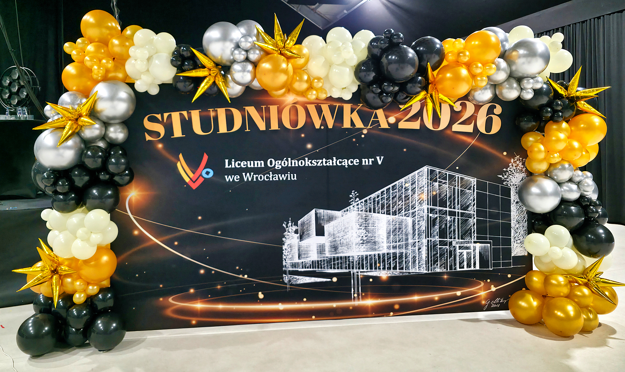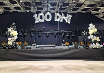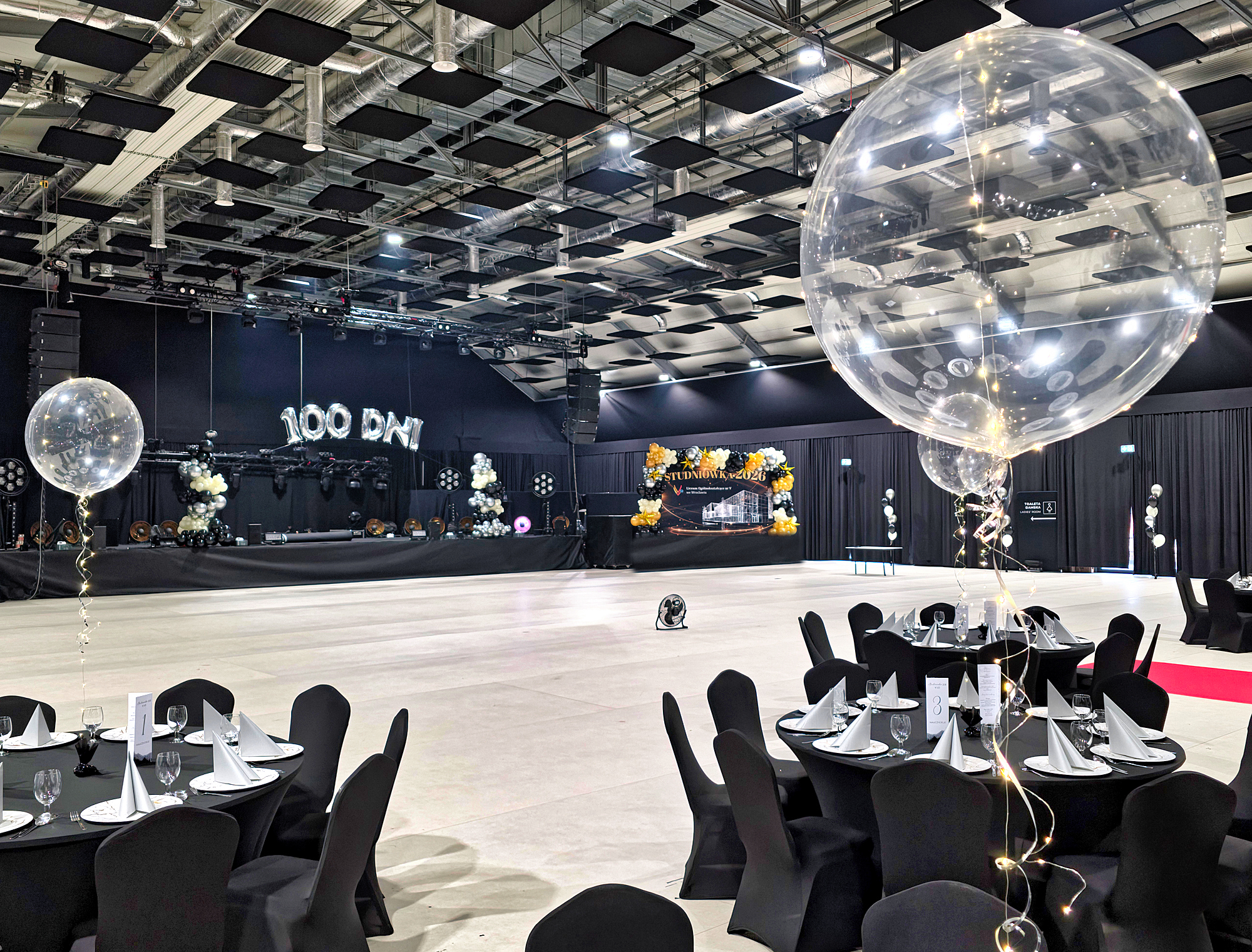 Dekorację balonową wykonaliśmy na Studniówkę V LO we Wrocławiu zorganizowaną w Terminal Event Center. Przy wejściu wzdłuż czerwonego dywanu ustawiliśmy balony napełnione helem i oplecione diodami led. Użyliśmy do tego przeźroczystych balonów na długich wstążkach. Tego samego typu balony zamontowaliśmy na stołach. Dało to niezwykle elegancki i gustowny efekt który zachwycił nie tylko nas. Na scenie zainstalowaliśmy organiczne kolumny z balonów które połączyliśmy łukiem helowym z napisem 100 DNI. Dzięki temu w tym centralnym miejscu jakim jest scena podkreśliliśmy charakter imprezy. Dodatkowo takim podkreśleniem były napisy STUDNIÓWKA 5 LO które rozwiesiliśmy po obu stronach sali. Kolejną instalacją balonową jaką przygotowaliśmy na ten bal była organiczna girlanda balonowa Ułożyliśmy ją wokół ścianki/banneru okolicznościowego. Razem stanowiły wspaniałe tło do zdjęć. Ścianka została usytuowana w pobliżu sceny wzmacniając zatem efekt dekoracyjny całej sali. Tu dodatkowo użyliśmy balonów w kolorze złotym nawiązując do grafiki na ściance. Dopełnieniem dekoracji były stroiki z balonów helowych ustawione dookoła. Podkreśliły one radosny nastrój imprezy. Jeśli również potrzebujecie dekoracji na swoje studniówki czy inne bale zapraszamy do kontaktu z naszą ekipą: biuro@gaudeo.pl.