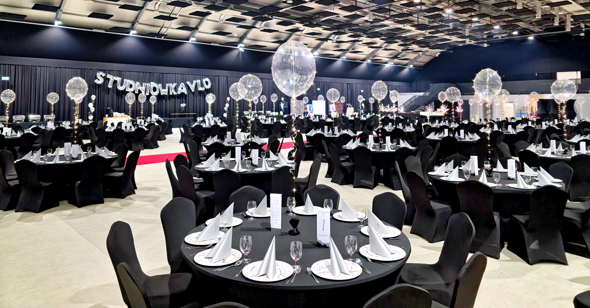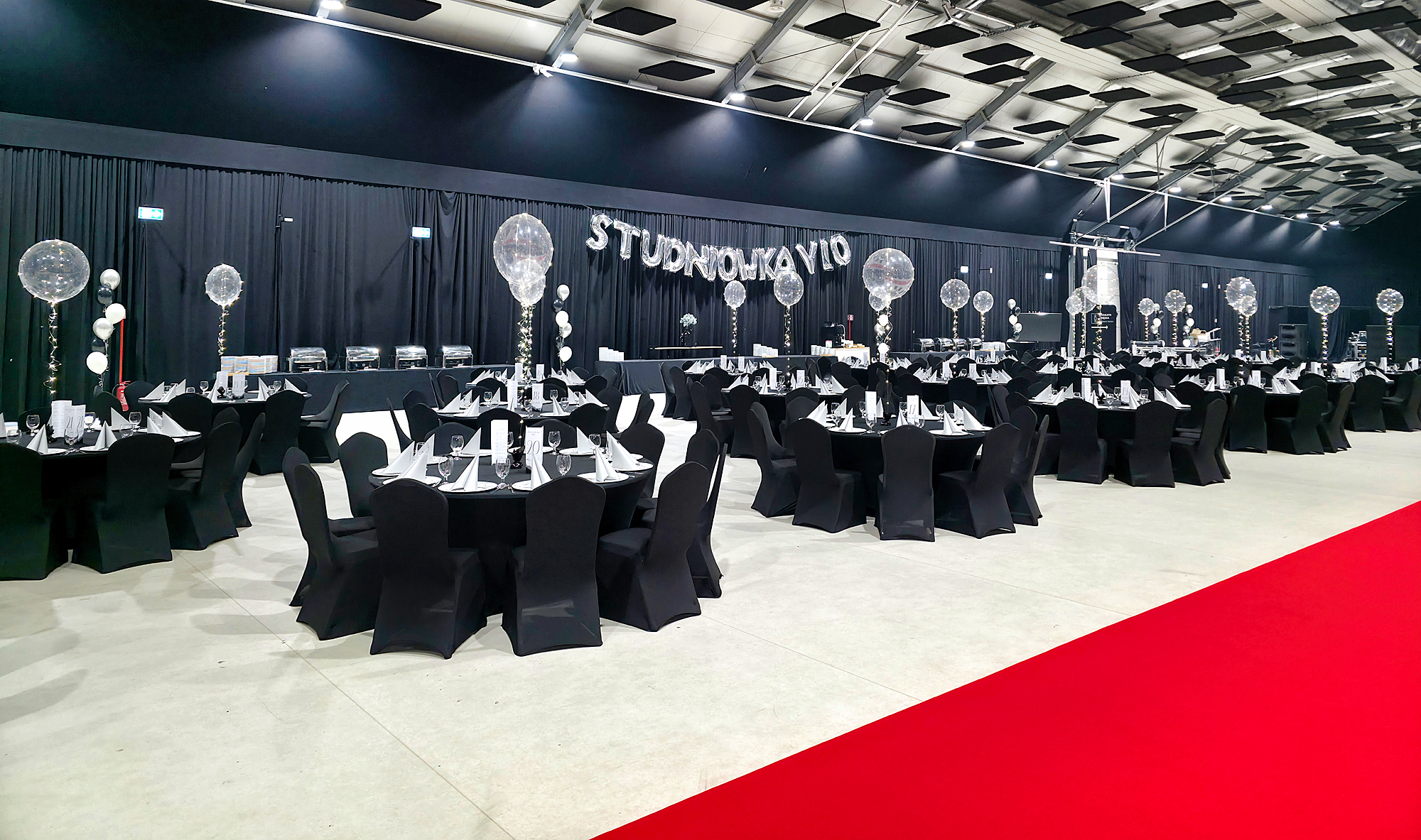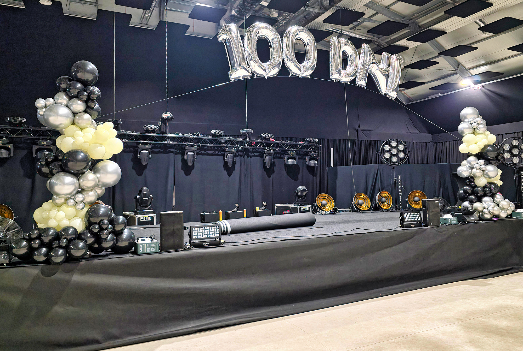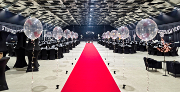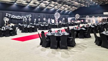 Dekorację balonową wykonaliśmy na Studniówkę V LO we Wrocławiu zorganizowaną w Terminal Event Center. Przy wejściu wzdłuż czerwonego dywanu ustawiliśmy balony napełnione helem i oplecione diodami led. Użyliśmy do tego przeźroczystych balonów na długich wstążkach. Tego samego typu balony zamontowaliśmy na stołach. Dało to niezwykle elegancki i gustowny efekt który zachwycił nie tylko nas. Na scenie zainstalowaliśmy organiczne kolumny z balonów które połączyliśmy łukiem helowym z napisem 100 DNI. Dzięki temu w tym centralnym miejscu jakim jest scena podkreśliliśmy charakter imprezy. Dodatkowo takim podkreśleniem były napisy STUDNIÓWKA 5 LO które rozwiesiliśmy po obu stronach sali. Kolejną instalacją balonową jaką przygotowaliśmy na ten bal była organiczna girlanda balonowa Ułożyliśmy ją wokół ścianki/banneru okolicznościowego. Razem stanowiły wspaniałe tło do zdjęć. Ścianka została usytuowana w pobliżu sceny wzmacniając zatem efekt dekoracyjny całej sali. Tu dodatkowo użyliśmy balonów w kolorze złotym nawiązując do grafiki na ściance. Dopełnieniem dekoracji były stroiki z balonów helowych ustawione dookoła. Podkreśliły one radosny nastrój imprezy. Jeśli również potrzebujecie dekoracji na swoje studniówki czy inne bale zapraszamy do kontaktu z naszą ekipą: biuro@gaudeo.pl.