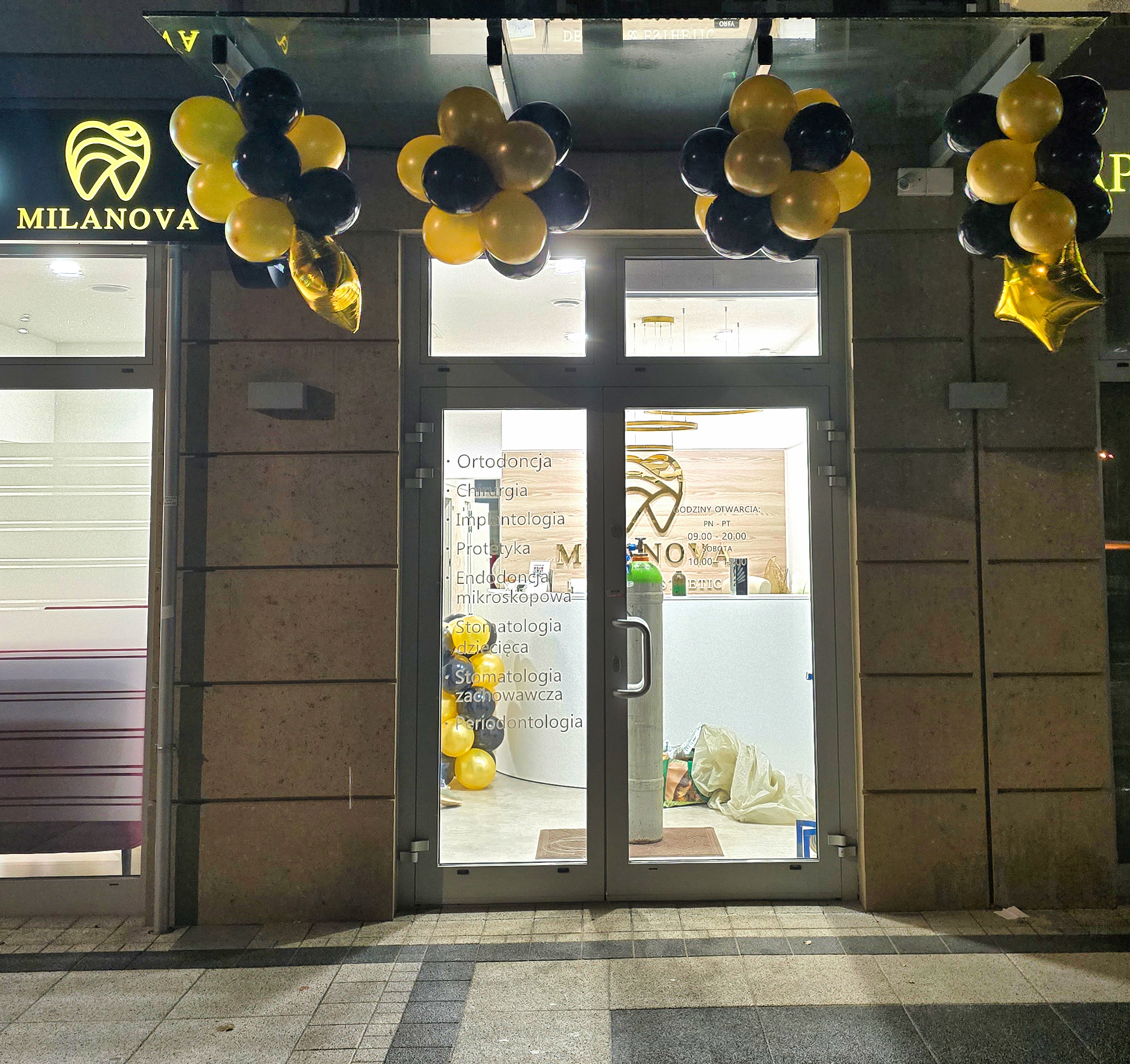 Urodzinową dekorację balonową przygotowaliśmy w Klinice Dentystycznej Milanova we Wrocławiu. Tak, tak to już rok odkąd klinika została otwarta i obsługuje swoich pacjentów. Do tej dekoracji przygotowaliśmy stroiki z balonów helowych w których wykorzystaliśmy balon w kształcie cyfry 1 aby podkreślić te pierwsze urodziny. Dodatkowo balony z helem puściliśmy luźno pod sufitem lokalu. Wypełniły one przestrzeń nadając jej wyjątkowego i odświętnego charakteru. Całość wykonana została w kolorystyce czarno-złotej. Eleganckiej i gustownej pasującej do charakteru i wykończeni wnętrza kliniki. Ostatnim akcentem były elementy balonowe zamontowane na zewnątrz tak aby przyciągnąć uwagę i zaprosić kolejnych klientów do odwiedzin. Jeśli również chcielibyście udekorować urodzinowo swoje lokale zapraszamy do współpracy – tel. 692404926.