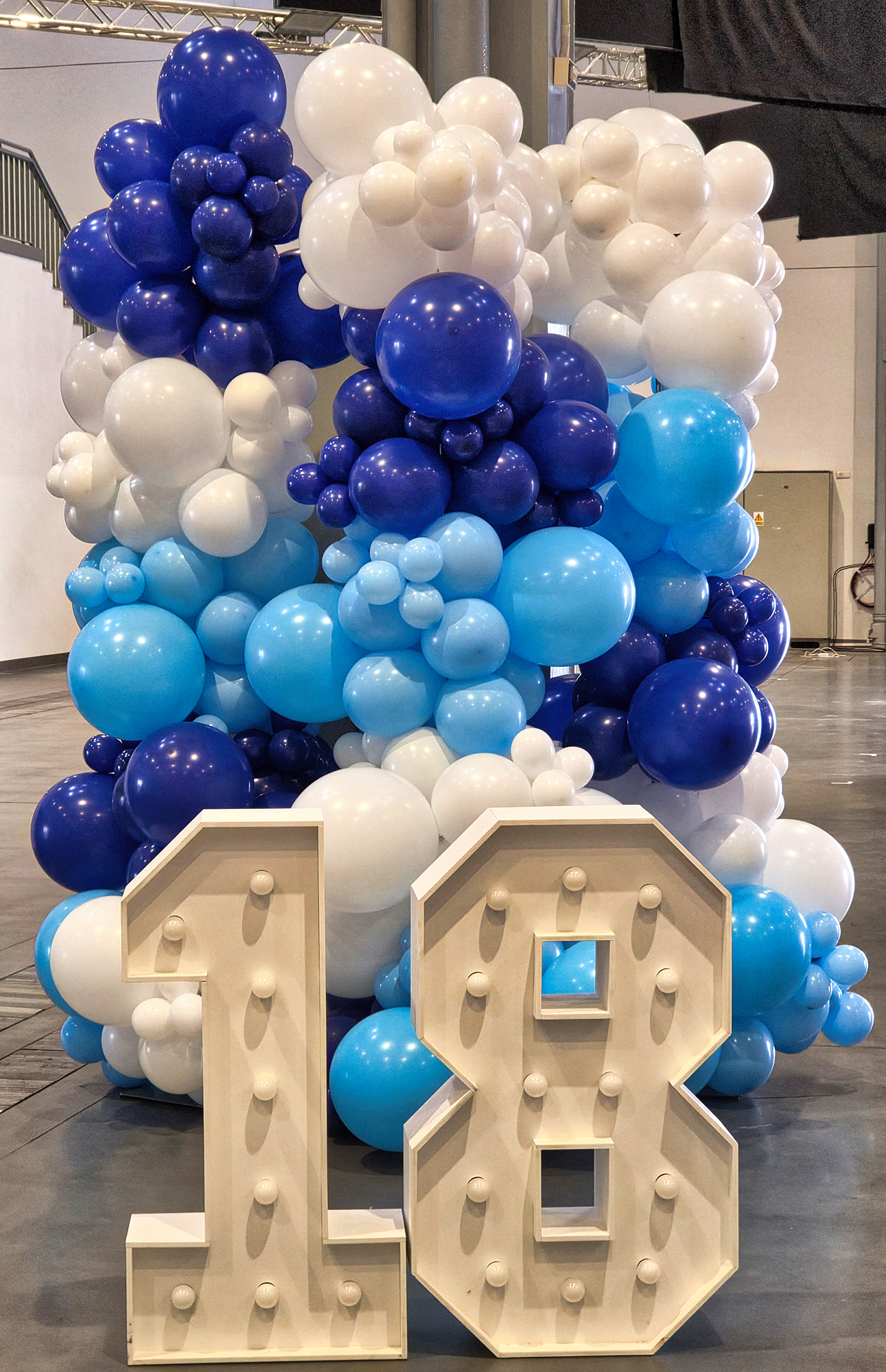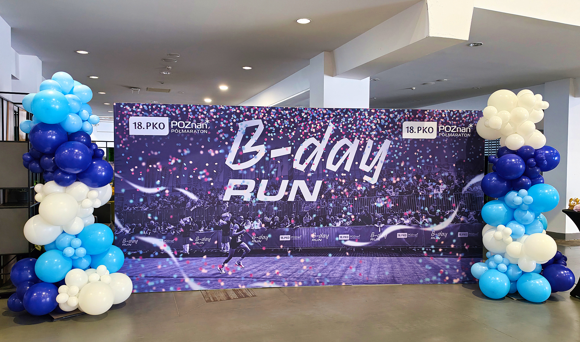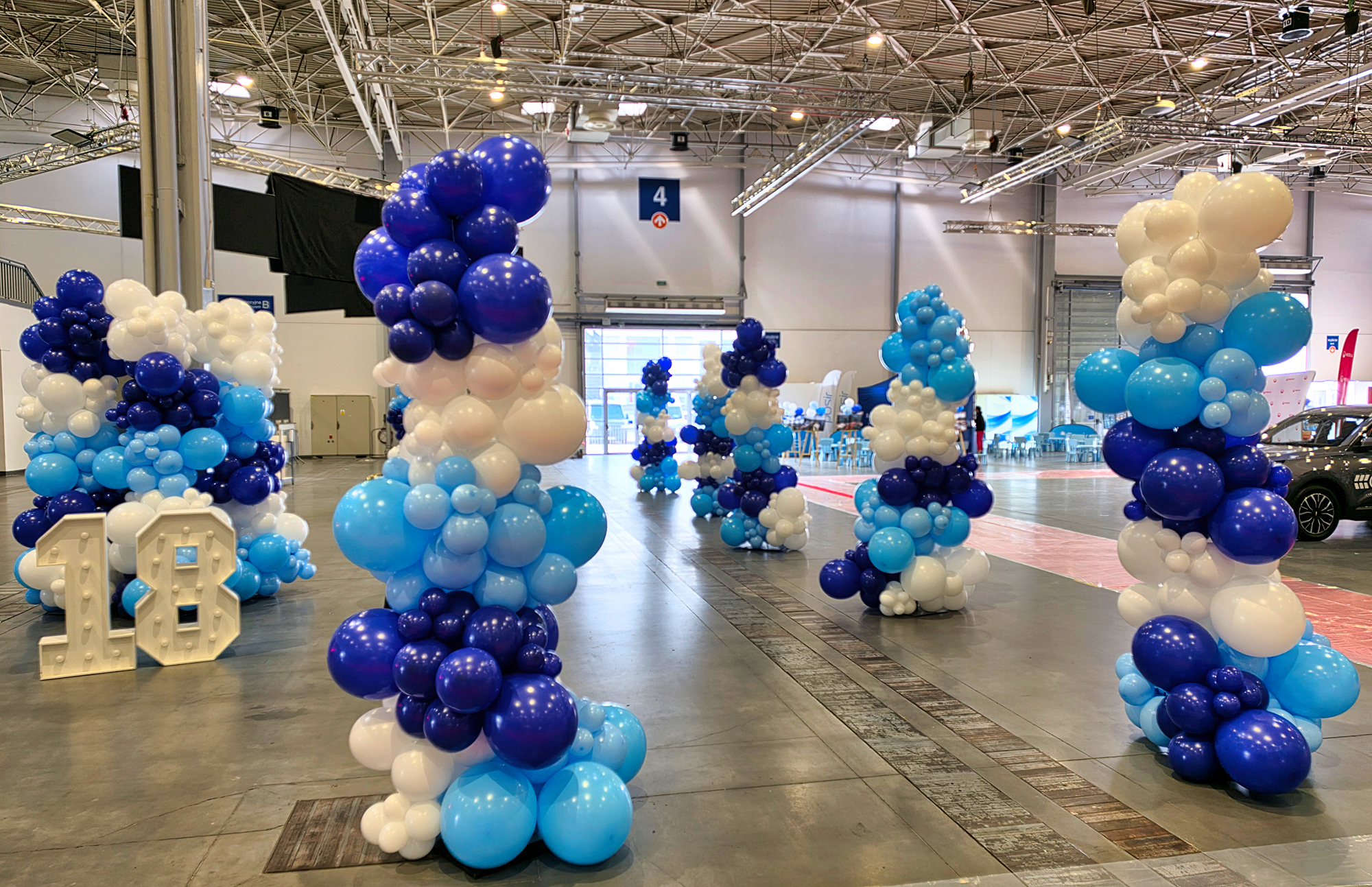 Dekoracje balonowe wykonaliśmy ostatnio w hali MTP w Poznaniu. To instalacje przygotowane z myślą o mającym się tam odbyć 18 poznańskim półmaratonie. Głównym elementem dekoracji były organiczne kolumny z balonów o wysokości przeszło dwóch i pół metra. Przygotowaliśmy je w niebiesko białej kolorystyce łącząc ze sobą balony o różnych rozmiarach w nieregularnym układzie. Tak przygotowane kolumny rozstawiliśmy po hali MTP dekorując strefę dla biegaczy. Stanowiły one również dekorację ścianki do zdjęć i tło za świecącą osiemnastką podkreślającą ten maratonowi jubileusz. Kolumny ze względu na swój rozmiar były doskonale widoczne a ich ciekawa forma przyciągała wzrok biegaczy. Takie kolumny to świetny sposób przy aranżacji takich dużych przestrzeni. Kolejne kolumny tym razem w odcieniach złota ustawione zostały przy banerze reklamowym kolejnego poznańskiego maratonu. Przygotowaliśmy również balonową bramę która była elementem oprawy strefy wejścia. Z jednej strony wskazywała uczestnikom miejsce wejścia na halę a jednocześnie stanowiła gustowne oddzielenie przestrzeni. Podkreślała miejsce przejścia od codzienności do świata biegaczy. Brama została ułożona z balonów o tej samej kolorystyce co kolumny. Całość dekoracji prezentowała się niezwykle gustownie wprowadzając klimat radości do tej imprezy. Jeśli również chcielibyście udekorować swoje wydarzenia nie tylko sportowe zapraszamy do kontaktu z naszą ekipą dekoratorów balonowych – piszcie na biuro@gaudeo.pl.