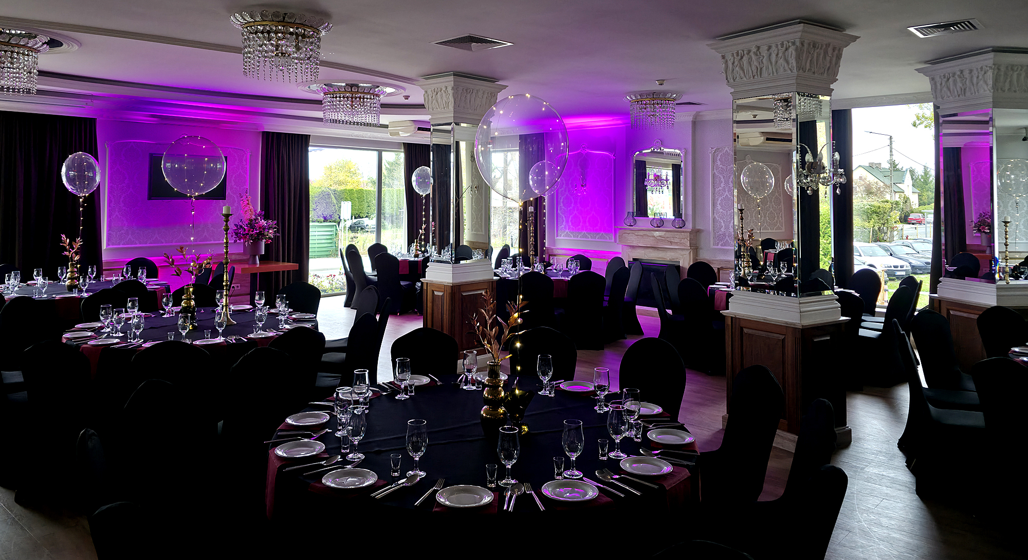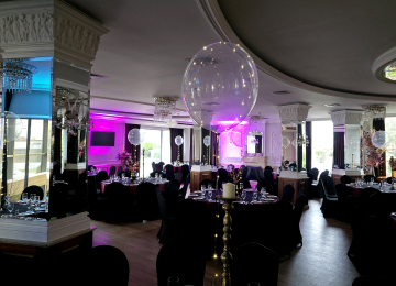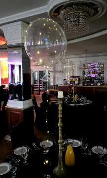 Dekorację z balonów helowych wykonaliśmy na imprezę urodzinową w jednym z wrocławskich hoteli. Do jej realizacji użyliśmy niezwykle eleganckich balonów plastikowych napełnionych helem. Dodatkowo opletliśmy je lampkami składającymi się ze złocistych diod led. Dzięki takiemu rozwiązaniu otrzymaliśmy kryształowe kule rozświetlane delikatnym punkcikami. Efekt potęgowały rozmieszczone na sali lustra. Mamy nadzieję że namiastkę uzyskanego efektu zobaczycie w naszej galerii, choć zdjęcia nie oddają tego do końca. Jeśli również będziecie organizowali urodziny i zależy Wam na eleganckim podkreśleniu uroczystości zapraszamy do kontaktu z naszą ekipą – telefon 692404926.