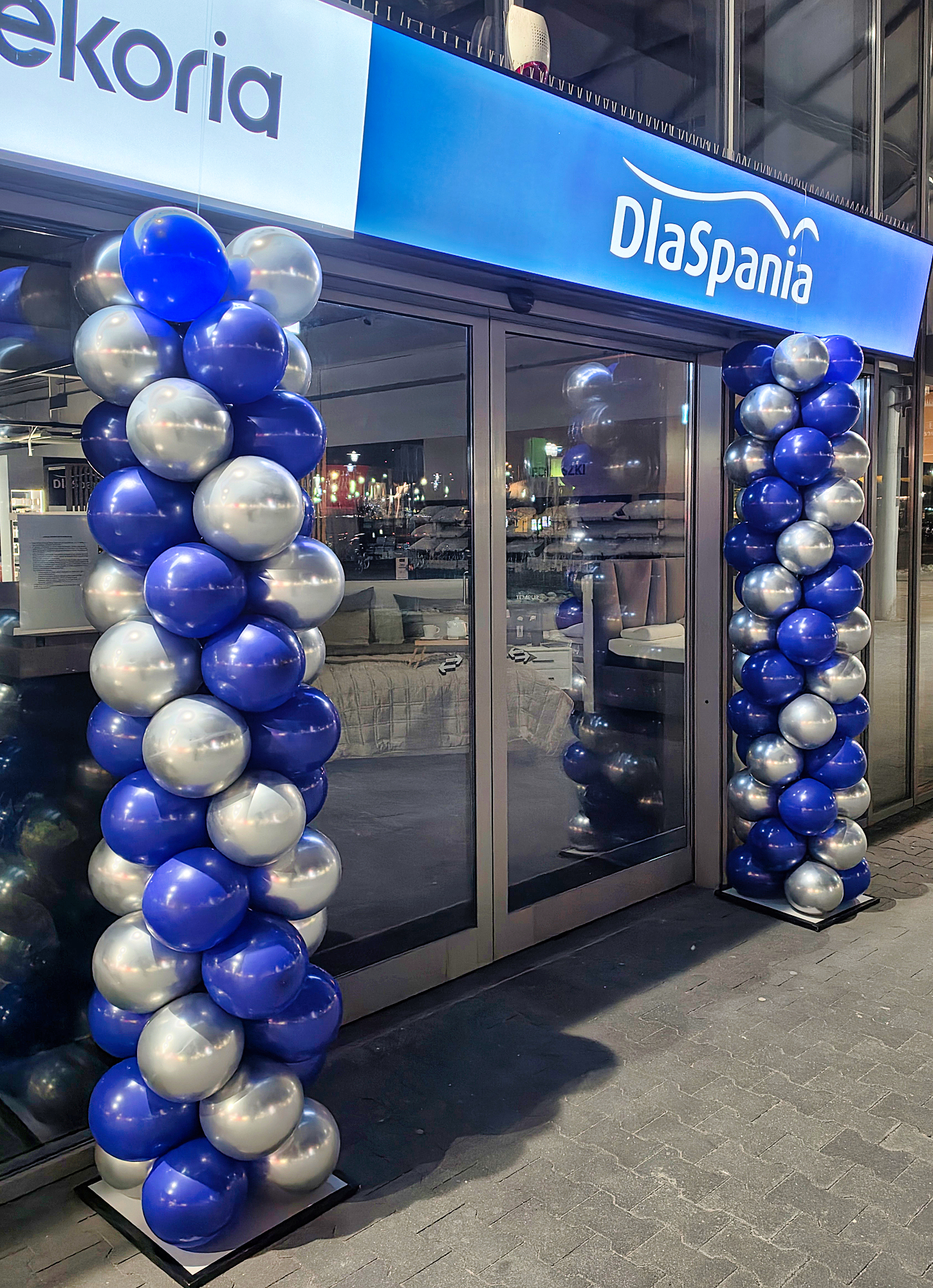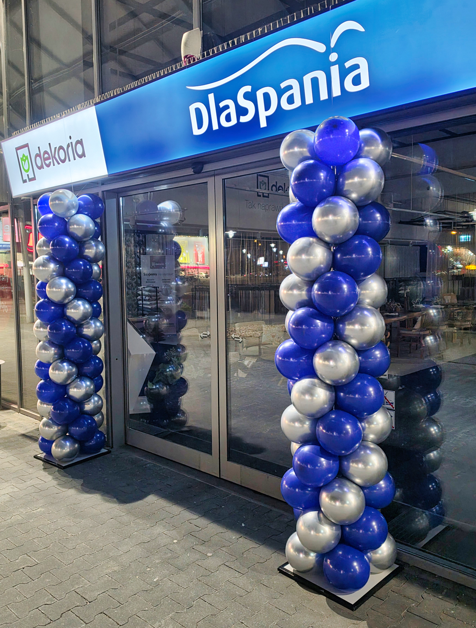 Kolumny z granatowo-srebrnych balonów dostarczyliśmy do Aleji Bielany we Wrocławiu. To dekoracja wejścia do salonu DlaSpania mająca za zadanie zwrócić uwagę klientów na atrakcyjne promocje przygotowane w lokalu. Kolumny ustawiliśmy po obu stronach wejścia dzięki czemu dobrze je podkreślają. Jeśli również chcielibyście takie kolumny balonowe przy swoich lokalach to zapraszamy do kontaktu z nami: biuro@gaudeo.pl.