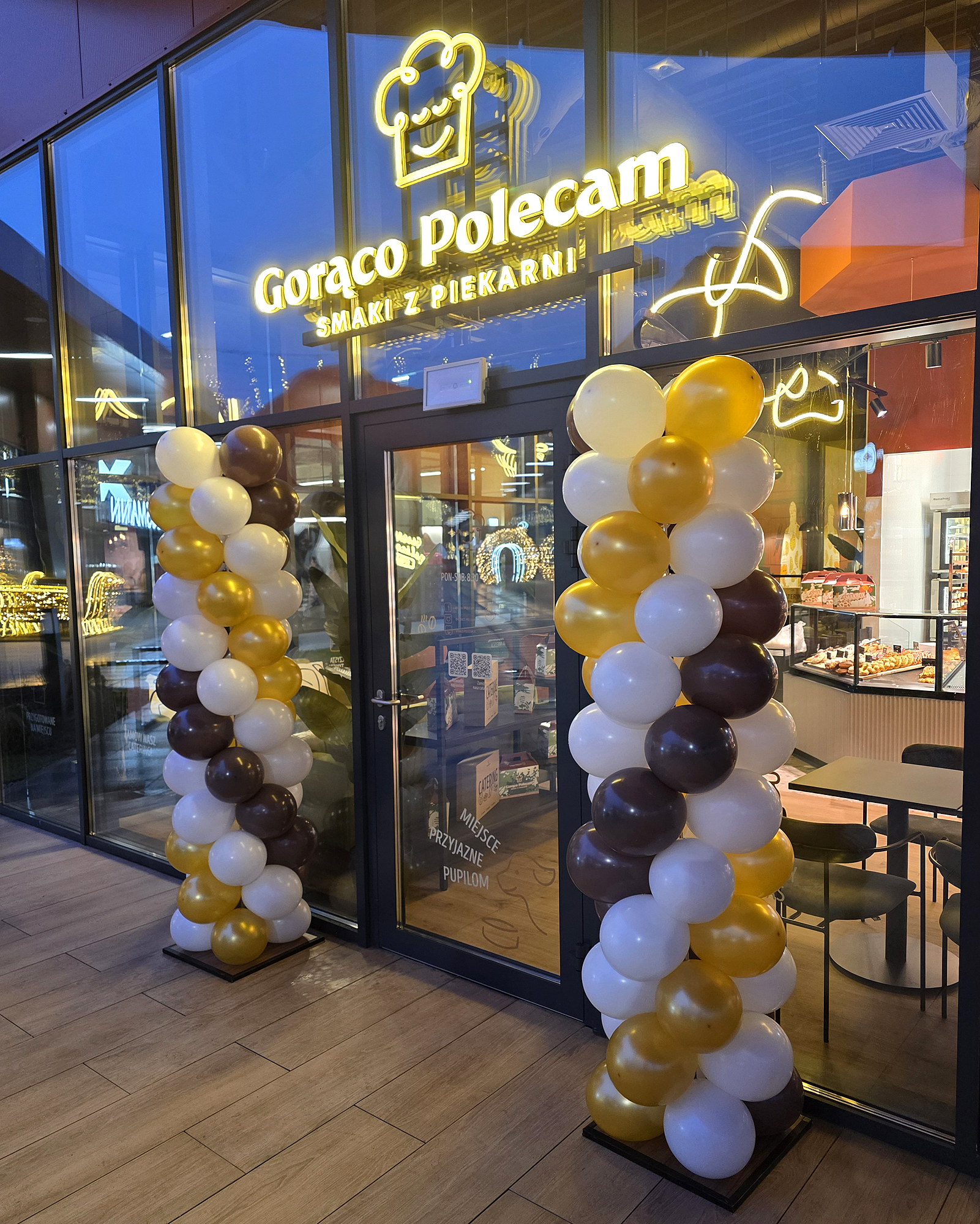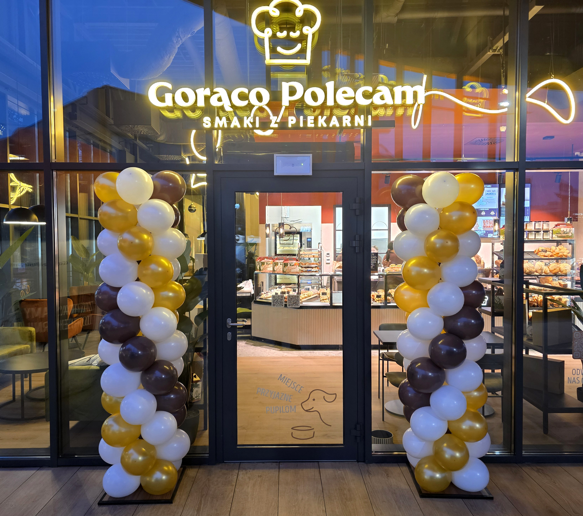 Kolumny z balonów dostarczyliśmy i zamontowaliśmy w Lubinie. To dekoracja z okazji otwarcia nowego lokalu Gorąco Polecam. To znana i lubiana sieć piekarnio-kawiarni. Jeśli więc macie chęć na świeży wypiek bądź aromatyczną kawkę kierujcie się zapachem a na pewno traficie. Możecie też wspomóc się wypatrywaniem balonów ;) Jeśli natomiast potrzebujecie dekoracji balonowej na otwarcie Waszego lokalu to zapraszamy do kontaktu z nami: biuro@gaudeo.pl.