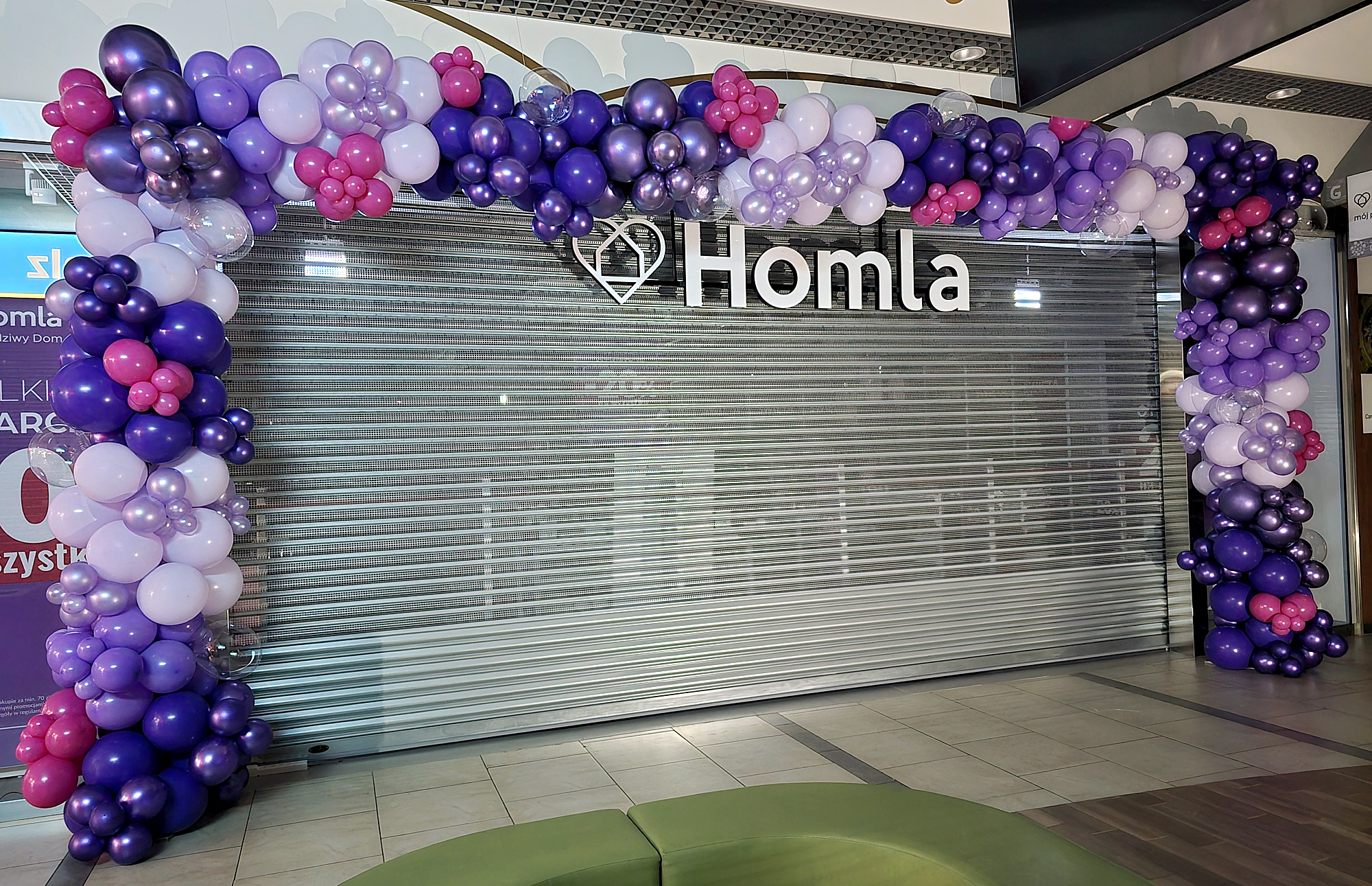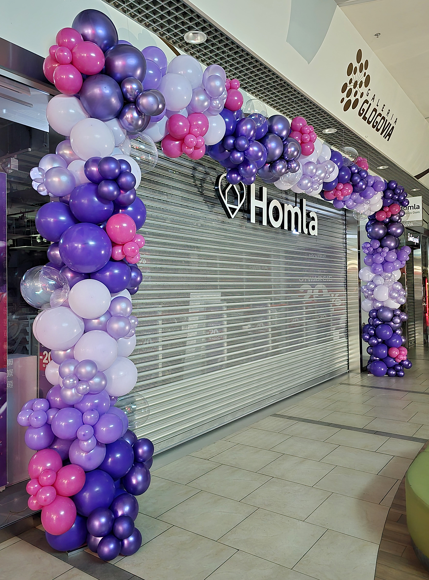 Organiczną bramę balonową wykonaliśmy na otwarcie sklepu Homla w Głogowie. Usytuowany on został w Galerii Glogovia. Dekorację wykonaliśmy z balonów w odcieniach fioletu z dodatkami balonów przeźroczystych i fuksjowych. Ułożyliśmy je w pozornie nieregularny sposób nazywany organicznym. Przy tym wszystkim zachowany musiał zostać kształt bramy. Podoba Wam się taka realizacja czy wolicie tradycyjne bramy balonowe? Zresztą niezależnie od tego jaki kształt ona ostatecznie przybierze i tak zwróci uwagę klientów na Wasz lokal. Chcecie wykorzystać balony do promocji swojego biznesu to zapraszamy do kontaktu z nami – biuro@gaudeo.pl.