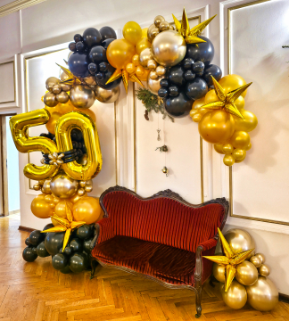Urodzinową dekorację balonową wykonaliśmy w restauracji Dwór Polski. Mieści się ona we Wrocławiu na samym Rynku i to stanowiło największą trudność tej realizacji. Znalezienie wolnego miejsca do zaparkowania w miarę w pobliżu graniczy z cudem :D Ponieważ na taką dekorację musimy zawsze przynieść potem dużą ilość sprzętu, balonów itp. bliska odległość jest dla nas ważna. Kiedy przynieśliśmy już wszystkie potrzebne materiały i narzędzia, mogliśmy zabrać się do pracy. Zamontowaliśmy organiczną girlandę w taki sposób aby można było usiąść na stylowej kanapie i wykonać sobie pamiątkowe fotki. Aby podkreślić charakter imprezy na girlandzie umieściliśmy balonową liczbę 50 w kolorze złotym. Całość wyglądała gustownie i elegancko wpasowując się styl otoczenia. Jeśli również chcielibyście taką dekorację dla siebie lub swoich bliskich zapraszamy do kontaktu z naszą ekipą – tel. 692 404 926.