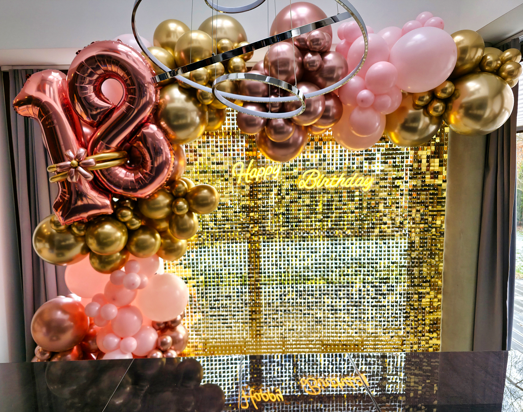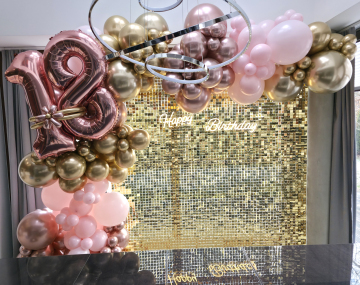 Ściankę balonową przygotowaliśmy na osiemnaste urodziny. Bazą była dekoracja z złotych cekinków które zamocowaliśmy na specjalnym stelażu. Na tak przygotowanym tle zawiesiliśmy neonowy napis Happy Birthday. Potem przyszła pora na balony. Wykorzystaliśmy te w odcieniu bardzo jasnego różu który połączyliśmy z różowo-złotym i złotem w wersji chromowanej. Dało to ciekawy, zestaw kolorów pasujących do osiemnastych urodzin dziewczyny. Kolejnym elementem tej artystycznej instalacji były balony w kształcie liczby 18. Te również miały kolor różowego-złota. Po zamocowaniu na ściance bardzo wyraźnie podkreśliły charakter imprezy. Przy tym doskonale skomponowały się ze świecącym neonem. Cała urodzinowa ścianka balonowa nabrała więc kobieco, uroczystego charakteru stanowiąc świetne tło dla pamiątkowych zdjęć. Jeśli chcielibyście taką bądź inną ściankę na swoich imprezach to zapraszamy do kontaktu z naszymi artystami: biuro@gaudeo.pl.