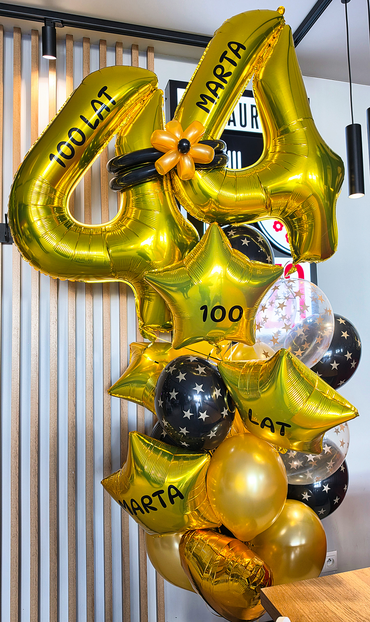 Bukiet balonów z helem dostarczyliśmy na imprezę z okazji 44 urodzin. Aby odkreślić tą datę użyliśmy balonów w kształcie cyfr które po napełnieniu helem umieściliśmy na górze stroiku. Aby uczynić go bardziej osobistym na balonach przykleiliśmy naklejki tworzące napis 100 Lat Marta. Ten sam napis został przyklejony jeszcze na balonach w kształcie gwiazdek. Dzięki temu został on wyjątkowo wyraźnie spersonalizowany. Cała kompozycję uzupełniliśmy jeszcze balonami helowymi o różnych kształtach tak aby kompozycja stała się ciekawsza. Tak przygotowany bukiet dostarczyliśmy do lokalu w którym miała odbyć się impreza urodzinowa. Jeśli również chcielibyście zrobić niespodziankę dla kogoś bliskiego to zapraszamy do kontaktu z naszymi dekoratorami. Przygotujemy również dla Was spersonalizowany stroik z balonów helowych i dostarczymy go na waszą imprezę, piszcie na: biuro@gaudeo.pl.