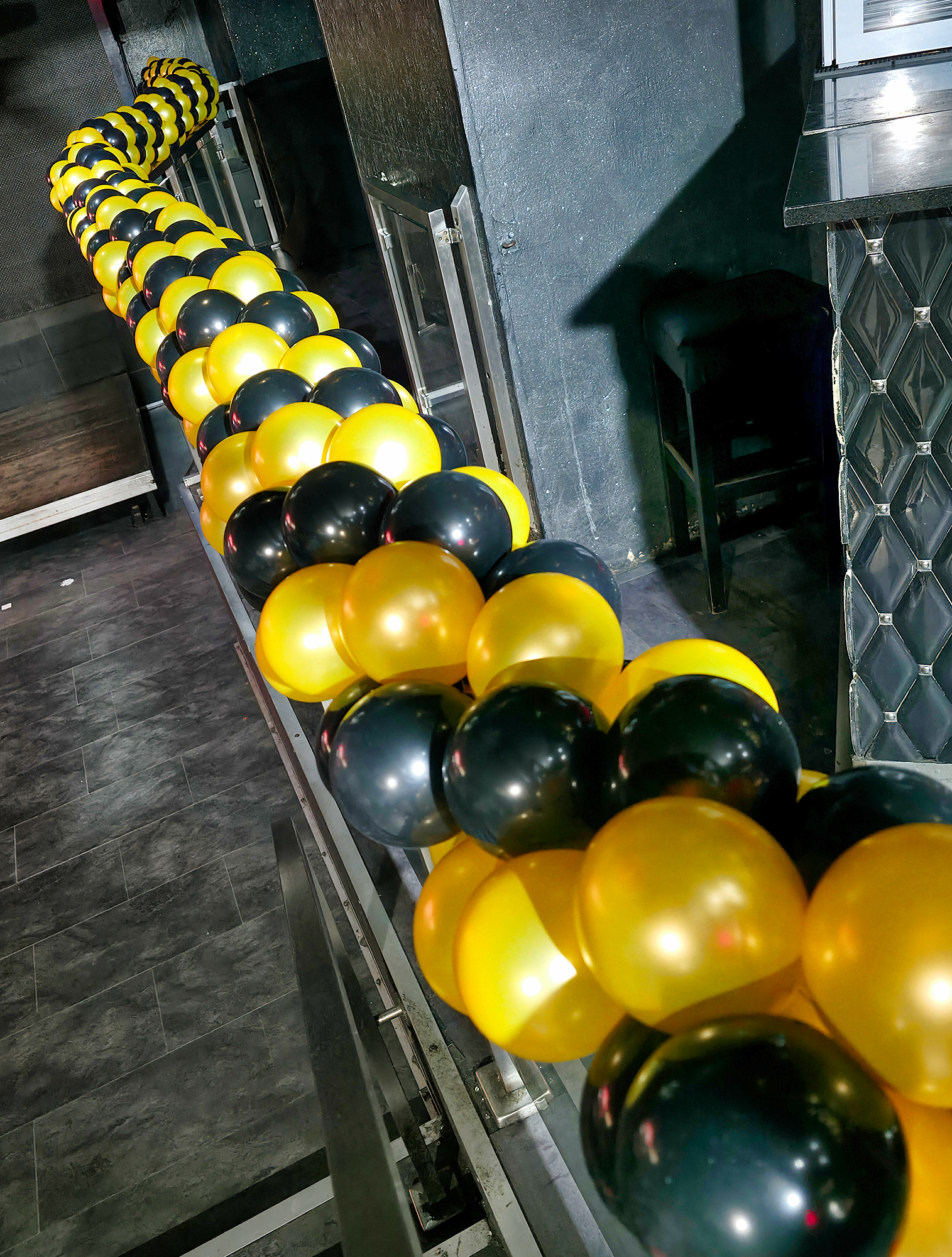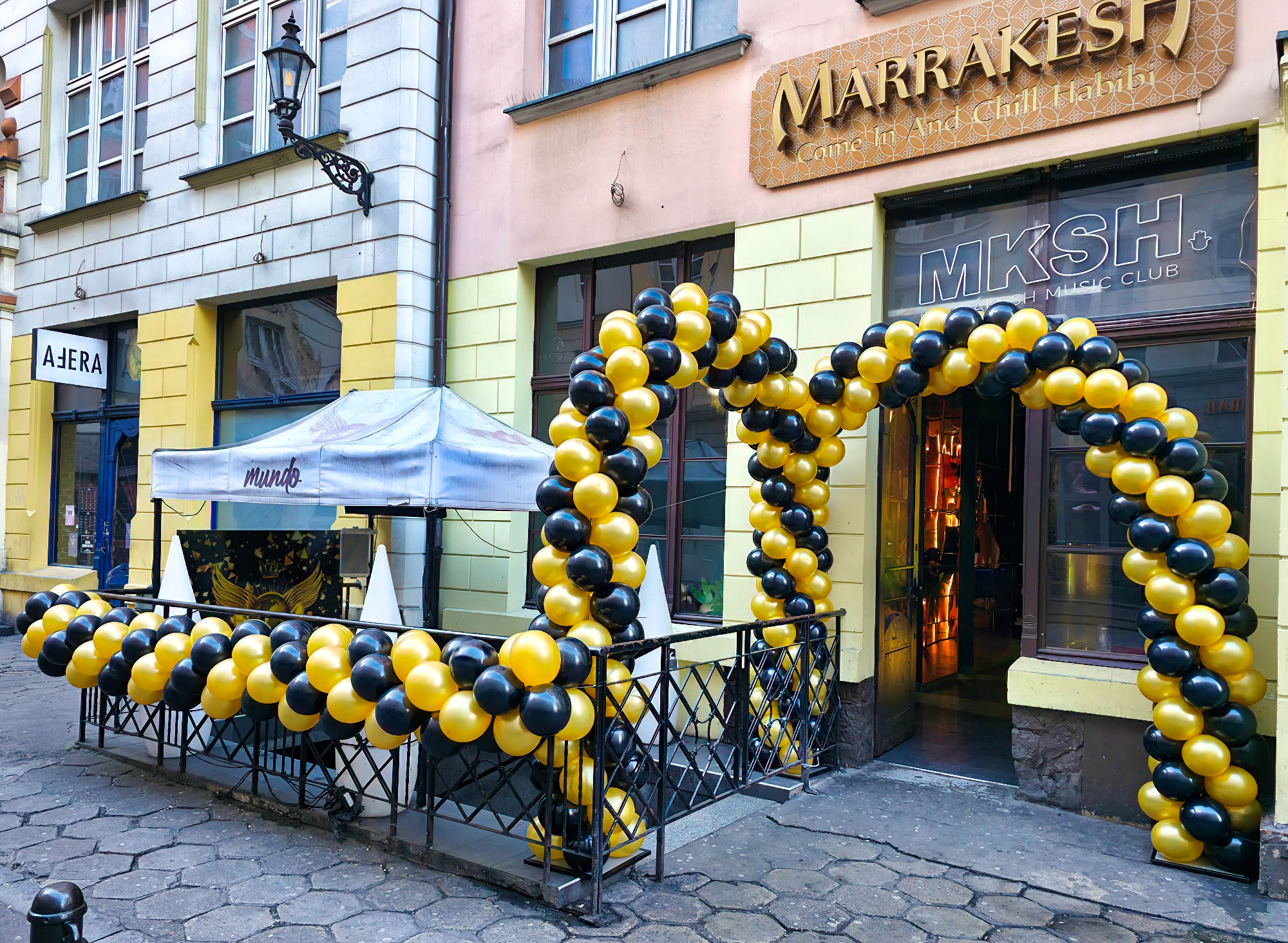 Sylwestrową dekorację balonową wykonaliśmy w klubach muzycznych we Wrocławiu w Pasażu Niepolda. Przyozdobiliśmy dwa kluby. Znajdujący się w podziemiu Mundo gdzie użyliśmy czarno-złotych balonów z których wykonaliśmy girlandy. Te girlandy zamontowaliśmy przy wejściu, na poręczach parkietu oraz przed i nad stanowiskiem DJ a także nad barem. Dodatkowo rozwiesiliśmy sople ze złotymi gwiazdkami i rozrzuciliśmy balony na podłodze. Kolejnym krokiem była dekoracja wejścia do klubów. Tu wykonaliśmy dużą podwójną bramę z balonów tak aby podkreślić wejścia do obu lokali. Kolejna girlanda balonowa trafiła na barierkę przy wejściu. Kolejne instalacje trafiły do klubu Marakesh gdzie powiesiliśmy girlandy ozdobione złotymi wstążkami przy stanowisku DJ. Na kratownicach przy ścianach zamontowaliśmy kwiatki ułożone z balonów. Dopełnieniem tej dekoracji były balony z helem i złotymi tasiemkami. Te puściliśmy swobodnie pod sufitem lokalu gdzie mogły swobodnie się przemieszczać zgodnie z podmuchami wentylacji i nagrzewnic. Zwisające wstążki potęgowały atmosferę zabawy i sylwestrowego klimatu. Jeśli również chcielibyście udekorować swoje lokale na sylwestrowe lub inne imprezy, zapraszamy do kontaktu: biuro@gaudeo.pl.