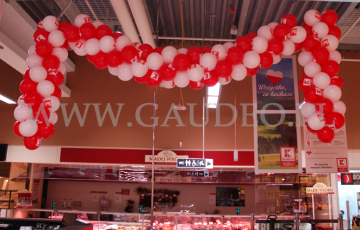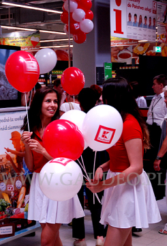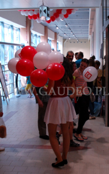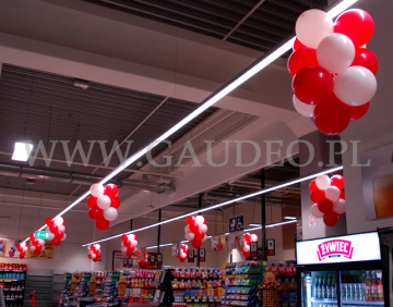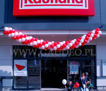 Tym razem w naszych balonowych podróżach trafiliśmy do Gorlic. To urocze galicyjskie miasteczko na południowym wschodzie Polski, znane z wielkiej bitwy w okresie I Wojny Światowej. Kojarzone może być także jako stolica polskich terenów roponośnych, jak i Beskidu Gorlickiego. W tym właśnie miasteczku wybudowany został nowy sklep sieci Kaufland, a nam przypadło zadanie wykonania dekoracji balonowej na to otwarcie. Tradycyjnie przy wejściu, zarówno wewnątrz jak i na zewnątrz sklepu, zawisły girlandy z balonów z nadrukowanym logo sieci. Do tego na terenie całego sklepu rozwiesiliśmy krótkie girlandy nazywane popularnie soplami. Wszystkie dekoracje wykonane zostały z balonów w kolorach biało-czerwonych. Dodatkowo przez cały pierwszy dzień pracy sklepu na zapleczu pompowaliśmy balony reklamowe i zakładaliśmy je na patyczki. Następnie hostessy zabierały je i rozdawały klientom sklepu. Na odwiedzających czekały też inne atrakcje w postaci konkursów paragonowych, występów iluzjonisty i mimów.
