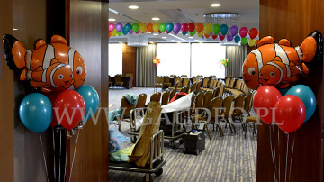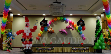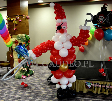 W miniony weekend agencja eventowa Anqa zorganizowała imprezę mikołajkową dla dzieci w stylu pirackim. I na tą zabawę mieliśmy przyjemność przygotować dekorację balonową. W wejściu witały nas napełnione helem balony w kształcie rybek. Takie stroiki widoczne już z drugiego końca korytarza bezbłędnie prowadziły zaproszone dzieci do miejsca zabawy. Na sali puściliśmy kolorowe łuki helowe, które doskonale wypełniły nam wolną przestrzeń. Dookoła Sali zawisły niewielkie stroiki z balonów, aby złamać swym kolorem jednolitą powierzchnię ścian. Na scenie popłynęły helowe rybki i pirackie okręty. Natomiast po obu jej brzegach stanęły balonowe figury. Z jednej strony kapitan piratów Mikołaj - z jednym okiem i maczetą w dłoni. Z drugiej strony wysmukła balonowa choinka. Całość była kolorowa i piracko- mikołajkowa.