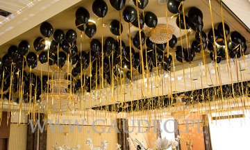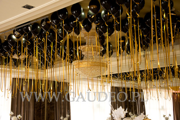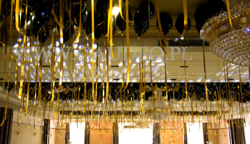 Czarne balony z helem przygotowaliśmy jako dekorację na imprezę urodzinową. Zorganizowana została ona w hotelu Haston. Do balonów przywiązaliśmy wstążeczki o niestandardowej szerokości. Normalnie używamy typowych – pięciomilimetrowych. Tu użyliśmy specjalnie sprowadzonych taśm o szerokości aż 20 milimetrów. Dzięki temu wstążki dużo bardziej odcinały się od tła i stanowiły element dekoracyjny. Do tego połączenie czerni ze złotem dało nam bardzo eleganckie zestawienie. Całość dała ciekawy efekt dekoracyjny, nam się podobało. A Wy co o tym sądzicie?