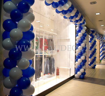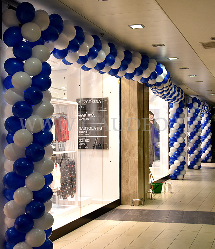 Brama z balonów dla nowego sklepu w Pasażu Grunwaldzkim. Tym razem otwierał się nowy punkt tureckiej sieci odzieżowej LC Waikiki. Jest to sieć oferujące kolekcje odzieżowe dla całej rodziny, rozpoczynając od dzieci, przez młodzież aż do osób dorosłych. W ostatnim czasie rozwija się w sposób bardzo dynamiczny wkraczając na rynki europejskie. To już ich drugi sklep we Wrocławiu. I to druga brama balonowa jaką dla nich wykonaliśmy. I tym razem również wykona była na całą długość witryny sklepowej. Podparta na 6 kolumnach. Wewnątrz sklepu również zawisły niewielkie kompozycje z balonów. Całość w niebiesko-białej kolorystyce sieci. Tak duża brama balonowa należy do mniej typowych dekoracji, jednak jej gabaryt proporcjonalnie przekłada się na zainteresowanie klientów.
