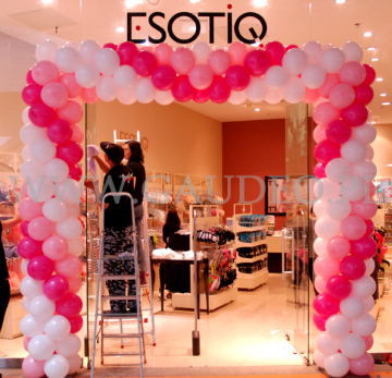 Kolejna z naszych prac to brama balonowa wykonana w Wałbrzychu na otwarcie sklepu z bielizną firmy Esotiq. Sklep usytuowany został na terenie galerii Victoria w Wałbrzychu. Brama wykonana została w delikatnych kobiecych kolorach łącząc dwa odcienie różu z bielą. Przeplot ułożyliśmy w sposób spiralny-symetryczny. Sklep już otwarty – zapraszamy do odwiedzin.