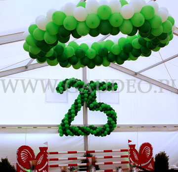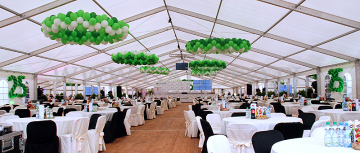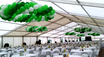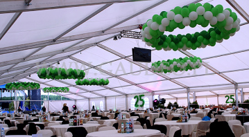 Agencja Eventowa Anqa organizowała wielkie imprezy plenerowe z okazji 25-lecia działalności swojego klienta. Nam w udziale przypadło wykonanie dekoracji balonowej imprezy. Całość organizowana była na terenie stadniny koni, gdzie stanęły trzy potężne namioty. Ponieważ całość odbywała się pod koniec czerwca, organizatorki postanowiły nawiązać wystrojem do nocy świętojańskiej. Jak wiemy wiąże się z nią obyczaj puszczania wianków na wodę – i takie balonowe wianki wykonaliśmy i rozwiesiliśmy pod sufitami namiotów. Każdy z namiotów miał 50 metrów długości, więc aby zachować proporcje każdy z wianków miał ponad osiem metrów obwodu. Całość wykonana została z balonów w dwóch odcieniach zieleni w połączeniu z bielą. Kolorystyka ta nawiązywała do kolorów firmowych klienta, komponując się świetnie z ideą plecionych z kwiatów wianków. Podwieszenie takich dużych kompozycji wypełniło nam przestrzeń sufitu, a jednocześnie przez swą ażurowość nie przytłaczało. Dopełnieniem dekoracji były poskręcane z balonów liczby „25” w mniejszej wersji rozwieszone na ścianach bocznych oraz ponad dwumetrowe cyfry umieszczone na ścianach szczytowych. Tak wykonana dekoracja podkreśliła charakter imprezy wpasowując się świetnie w jej sielską atmosferę.