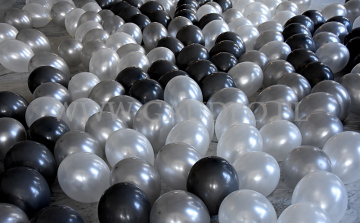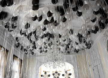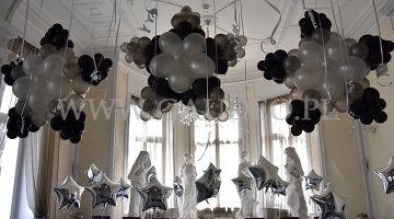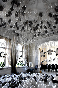 Kolejna dekoracja z balonów na imprezie dla dzieci zorganizowanej przez agencję Hopek. Tym razem zabawa odbywała się we wrocławskim Hotelu Platinum Palace. Pod sufitem Sali puszczone zostały balony z helem i wstążeczkami. Kontrapunktem dla nich były balony z powietrzem rozrzucone po podłodze sali. Całość w bardzo stonowanej kolorystyce połączenia kolorów perłowego, srebrnego i ciemno szarego. Dodatkowo wykonaliśmy również balonowe gwiazdki. Rozwieszone zostały one na oknach i w przejściu między salami zabawową i bankietową. Balonowe gwiazdki foliowe napełnione helem użyte zostały również do przyozdobienia krzeseł i narożników. Całość świetnie wpisywała się styl hotelu i stanowiła doskonałe tło dla bawiących się dzieci.