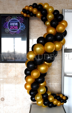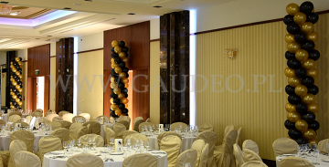 Dekorację z balonów na bal Sylwestrowy wykonaliśmy we wrocławskim Hotelu Haston. Wysokie czarno-złote kolumny ustawione zostały z obu stron sali. Natomiast na barze powiesiliśmy fikuśne „S” wyplecione z małych baloników. Dekoracja tego typu doskonale podkreśla nastój tej wyjątkowej nocy. Cieszymy się więc, że mogliśmy wprowadzić gości hotelowych w szampański nastój zabawy.