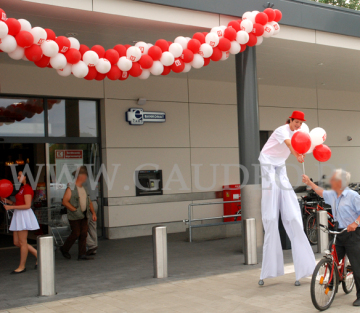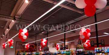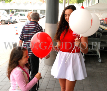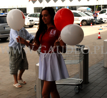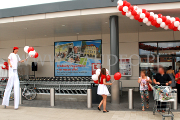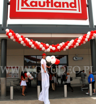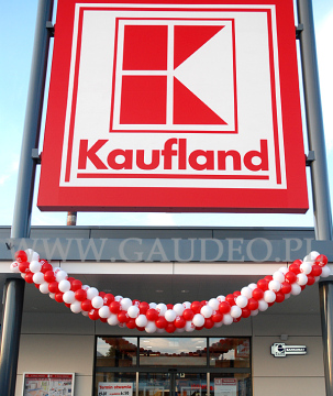 Po raz kolejny obsługiwaliśmy uroczyste otwarcie sklepu sieci Kaufland, która wielkim krokami zbliża się do ilości 200 sklepów na terenie Polski. Tym razem sklep otworzył się na Dolnym Śląsku w Kamiennej Górze. Przed wejściem do sklepu pod olbrzymim logo sieci zawisła girlanda z balonów. Girlandy powiesiliśmy również przy wejściu na teren hali sprzedaży. Na terenie całego sklepu rozwieszone zostały również krótkie girlandy balonowe w branży nazywane soplami. Wszystko oczywiście w kolorach sieci tj. biało-czerwonych. Przez cały dzień otwarcia obsługiwaliśmy je balonowo tj. dmuchaliśmy balony powietrzem i zakładaliśmy na patyczki. Były to balony specjalnie przygotowane do tego celu poprzez nadrukowanie na nich logotypu sklepu. Po nadmuchaniu i założeniu były one zabierane przez hostessy i rozdawane klientom sklepu. Balony rozdawał również mim na szczudłach. Kamiennogórzanie licznie przybyli do Kauflandu świętując otwarcie nowego punktu handlowego w swoim mieście.