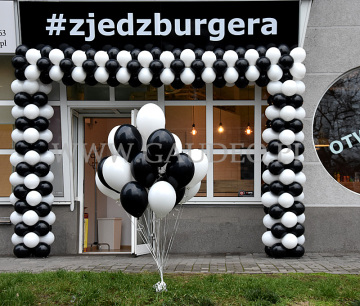 Dziś na ulicy Strzegomskiej we Wrocławiu otworzył się nowy bar – Zjedzburgera. I na jego otwarcie przygotowaliśmy dekorację balonową. Po obu stronach lokalu stanęły kolumny balonowe a pod kasetonem reklamowym podwieszona została balonowa girlanda. Na trawniku przed sklepem dodatkowo zamocowany został pęk balonów helowych. Ta prosta w formie dekoracja świetnie skomponowała się z minimalistycznym wystrojem lokalu a pracownicy sąsiadujących biurowców otrzymali sygnał iż nowy lokal już działa i zaprasza na posiłek. My również zapraszamy a jak się w sekrecie dowiedzieliśmy w ofercie są również burgery w wersji wegetariańskiej.