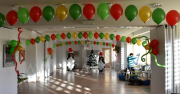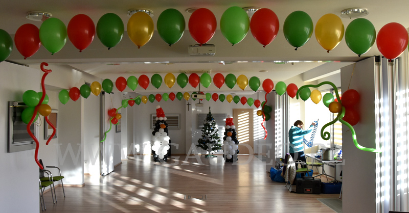 Agencja Anqa zorganizowała mikołajkową zabawę dziecięcą w siedzibie jednej z wrocławskich firm. Tematem imprezy były Mikołaj z pingwinkami. Dlatego przypadło nam zadanie wykonania z balonów pingwinów które stanowiły centralny element dekoracji. Dodatkowo w poprzek sali wykonane zostały łuki z balonów helowych. Ten sposób aranżacji przestrzeni spowodował optyczne skrócenie pomieszczenia. Delikatne stroiki balonowe rozwieszone zostały dookoła sali tak aby wypełnić puste przestrzenie. Całość utrzymana była w kolorystyce świątecznej a więc nie mogło braknąć czerwieni, złota i zieleni. Dekoracje balonowe to sprawdzony sposób na wzbogacenie imprez każdego rodzaju.