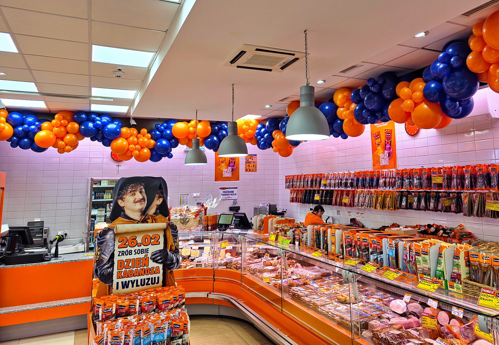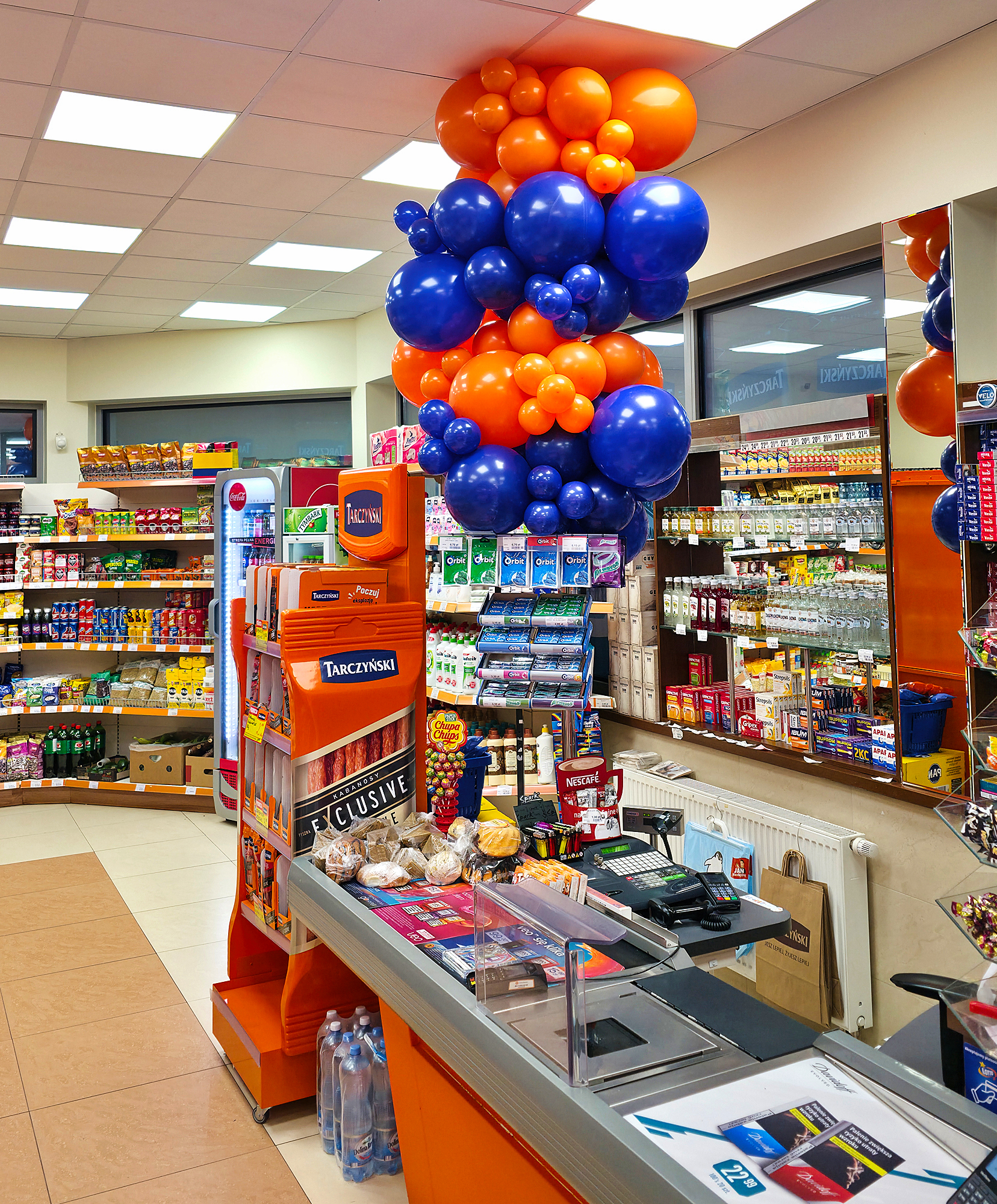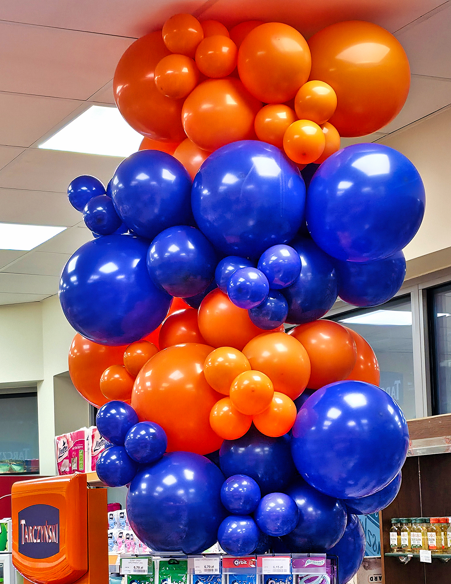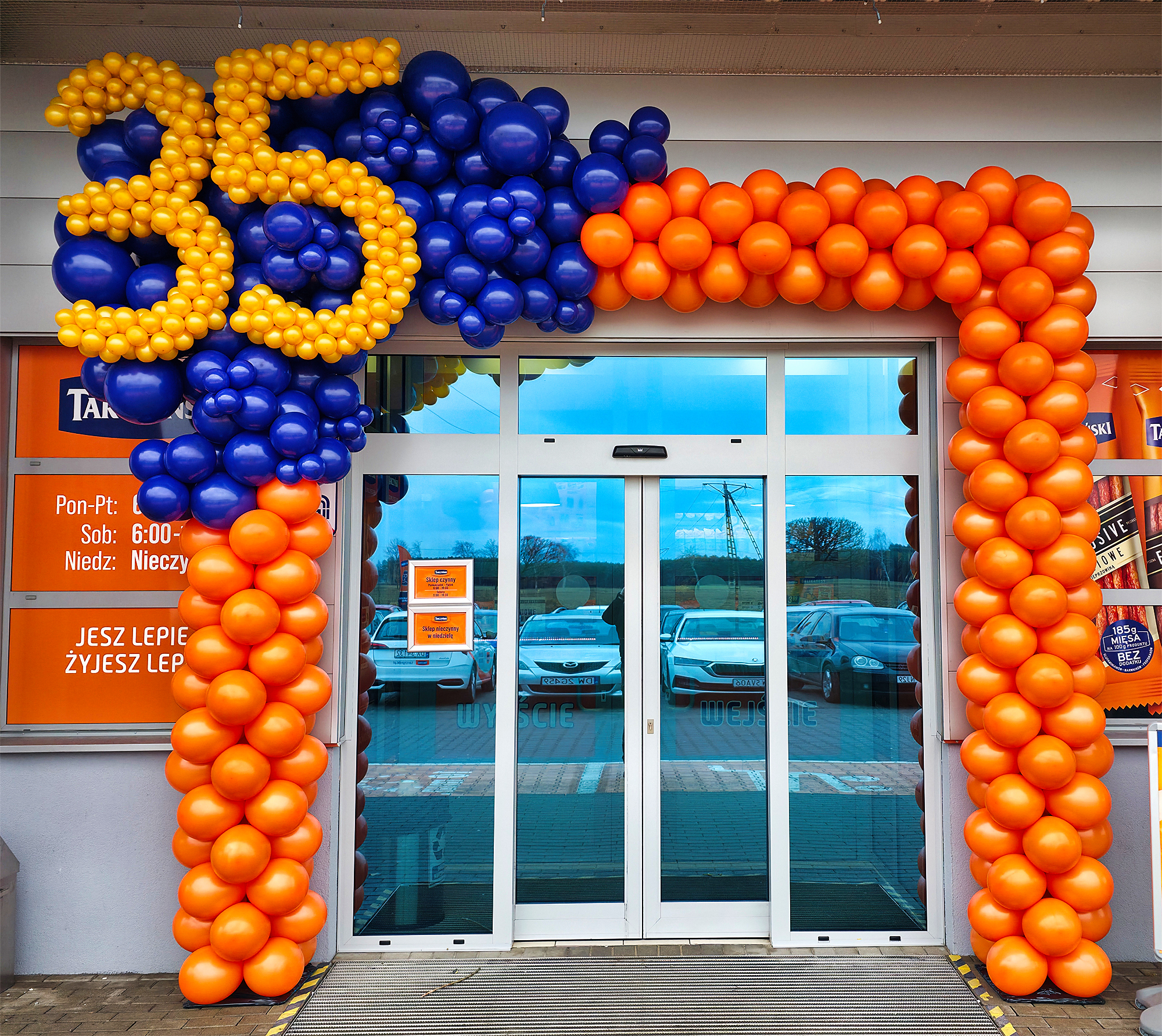 Instalacje balonowe przygotowaliśmy w miejscowości Ujeździec Mały. To dekoracje sklepu firmowego firmy Tarczyński z okazji 35 urodzin firmy oraz Dnia Kabanosa. Przed wejściem do sklepu zamontowaliśmy bramę z balonów. Jej lewy górny narożnik ułożyliśmy w sposób organiczny z granatowych balonów. Na tych granatowych balonach przymocowaliśmy balonową liczbę 35 w kolorze złotym. Ta różnica kolorów sprawiła że była ona bardzo czytelna. Pozostała część bramy uzupełniona została balonami w kolorze pomarańczowym. Wewnątrz sklepu wykonaliśmy kilkunastometrową organiczną girlandę z balonów która została zamontowana wzdłuż lady pod sufitem. Oczywiście również w kolorach granatu i pomarańczu. Dzięki temu sklep zyskał wyjątkowy, świąteczny wygląd. Przygotowaliśmy też okolicznościowy nadruk na balonach które nadmuchaliśmy powietrzem i założyliśmy na patyczki. Ostatnim akcentem naszej pracy był montaż również organicznej dekoracji z balonów na rurze kasy działu samoobsługowego. Taka kompleksowa dekoracja urodzinowa z pewnością zwraca uwagę klientów na sklep i wprowadza ich w wyjątkowy nastrój czego byliśmy świadkami jeszcze w czasie montażu. Z okazji święta sklep przygotował bardzo atrakcyjną promocję na kabanosy – jeśli jesteście ich fanami wpadajcie na zakupy do końca tygodnia. Jeśli chcielibyście mieć takie dekoracje na swoich urodzinach zapraszamy do kontaktu z nami: biuro@gaudeo.pl.
