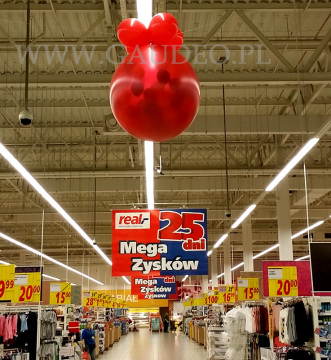 Balon strzelający to wielki balon o średnicy około 90 cm. Wewnątrz niego znajdują się malutkie baloniki. Tym razem dodatkowo wewnątrz malutkich baloników znajdowały się karteczki z kuponami. A kupony można było wymienić na atrakcyjne nagrody przygotowane przez obsługę sklepu dla klientów. Był to element obchodów „25 DNI REAL”, a więc czasu niezwykle korzystnych promocji. O uzgodnionej godzinie, w kulminacyjnym momencie, balon strzelił, a zawartość wysypała się na zgromadzonych klientów. Towarzyszyła temu porcja zabawy, ale też rywalizacji o wartościowe kupony. Takie balony strzelające to doskonała alternatywa dla „gradu balonów”, to zarazem świetny sposób zrzucenia kuponów na klientów.