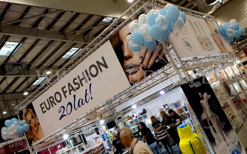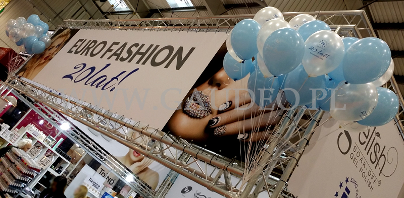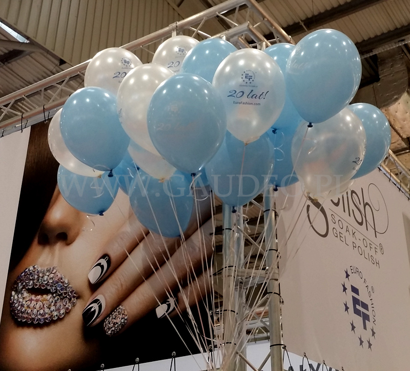 Jednym z wystawców warszawskich targów fryzjerskich była firma Euro Fashion. Firma to obchodzi też 20 lecie swojej działalności. Z tej okazji wykonaliśmy dla niej nadruk okolicznościowy na balonach. Balony te następnie napełniliśmy helem i powiązaliśmy w duże pęki. Następnie zamocowane zostały do konstrukcji stoiska targowego. Balony helowe unoszące się wysoko ponad głowami odwiedzających doskonale przyciągały uwagę do udekorowanego stoiska.
