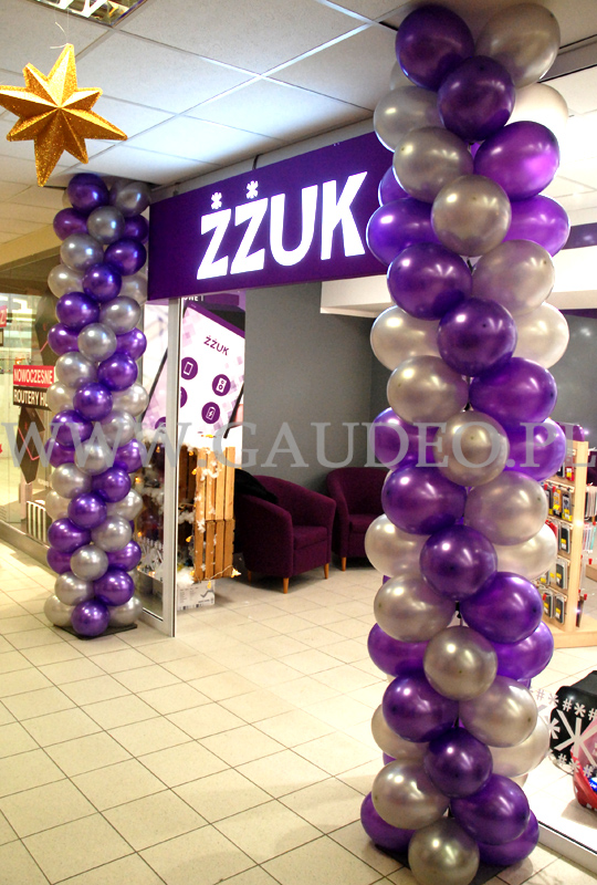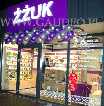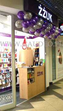 Girlandy balonowe wykonaliśmy dla sieci salonów z akcesoriami do telefonów komórkowych ŻŻUK. W tym celu odwiedziliśmy kolejne salony usytuowane we Wrocławiu i Warszawie. W niektórych girlandy podwieszone zostały pod kasetonem. W innych stanęły w formie balonowych kolumn. Wykonane zostały z balonów w kolorze fioletowym połączonym z białą perłą. Tymi dekoracjami właściciel chciał podkreślić, że salony już działają i zapraszają. Dodatkowo w tym przedświątecznym okresie dekoracja zwróciła uwagę kupujących na asortyment sklepów, a to zawsze się opłaca ;)