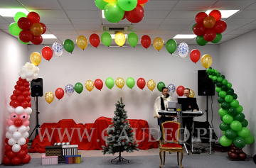 Balonową dekorację wykonaliśmy na dziecięcą imprezkę w siedzibie firmy. To kolejne już mikołajki zorganizowane przez agencję Anqa, które upiększamy ;) Tym razem sala była malutka, więc ciężko było zmieścić coś większego. Wykonaliśmy więc balonowy łuk helowy łączący choinkę z Mikołajem. Balony dobraliśmy w świątecznej kolorystyce. Dodatkowo na części z nich wykonany został nadruk z motywami świątecznymi. Pod sufitem, aby wypełnić trochę przestrzeń, podwiesiliśmy balonowe kulki zwane popularnie dwunastkami. Nazwa pochodzi od ilości balonów, z których je wykonujemy. Kolejnym i ostatnim elementem tej świątecznej układanki były niewielkie stroiki, które trafiły na okna i przed wejściem do budynku. Dzięki umieszczeniu balonów na dworze wszyscy goście doskonale wiedzieli, gdzie mają się kierować.