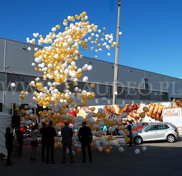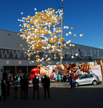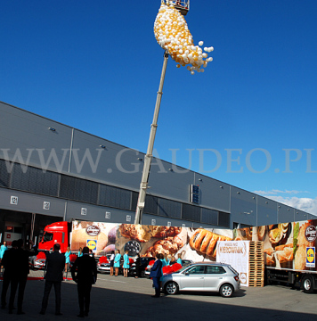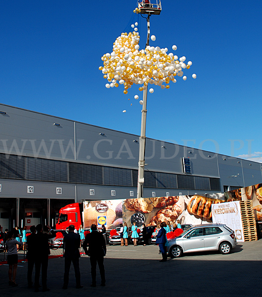 Zrzucanie balonów w siedzibie Lidla w Legnicy to kolejna udana realizacja z agencją eventową AnQa. Impreza została zorganizowana, aby uhonorować wyróżniających się kierowników prowadzących sklepy tej sieci. Ponieważ mieli oni jako nagrody otrzymać nowe samochody służbowe, konieczne było ich przyozdobienie. W tym celu wykonaliśmy kokardy-pompony, które zostały następnie zamocowane na przednich maskach pojazdów. Czerwony kolor dekoracji wyraźnie odcinał się na srebrnych czy granatowych samochodach. Kiedy te zostały już udekorowane, mogliśmy przystąpić do drugiej części realizacji. Na złotych i białych balonach już wcześniej przygotowaliśmy nadruk okolicznościowy. Teraz musieliśmy balony te nadmuchać i umieścić w siatce. Kiedy zostały już przygotowane, siatka została zamontowana na wysięgniku. Przed rozpoczęciem imprezy ramię podnośnika wraz z balonami i obsługą wjechało do góry. Teraz pozostało już tylko czekać na kluczowy moment. Kiedy wybrzmiał umówiony sygnał, siatka została otwarta, a balony posypały się w dół. Następnie opadły na wyróżnione osoby dając asumpt do wybuchu radości. Zresztą przyznajcie sami – kto z Was nie miałby ochoty zostać obsypanym balonami?! Jeżeli więc chcecie sprawić taką niespodziankę swoim pracownikom, gościom bądź klientom, zapraszamy do kontaktu z nami: 692 404 926.