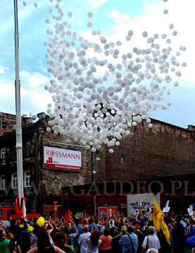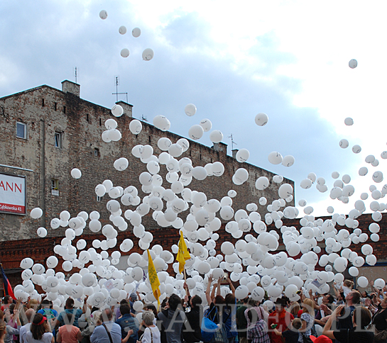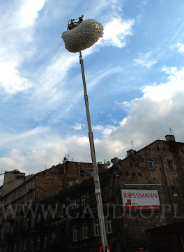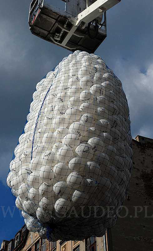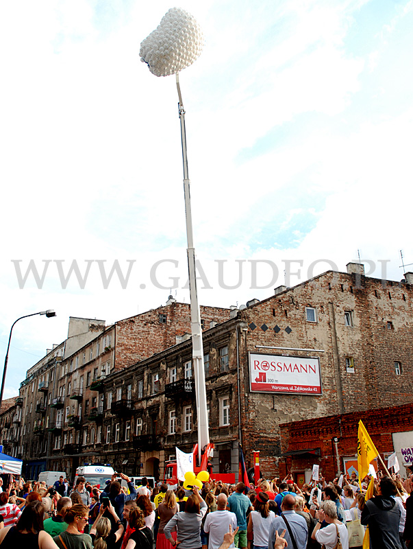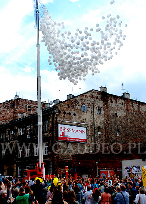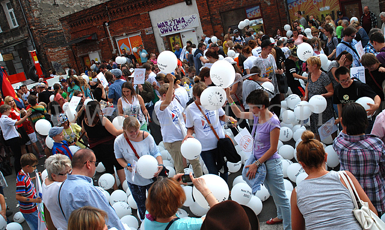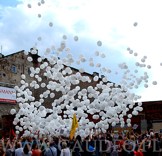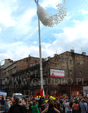 Na warszawskiej Pradze odbyła się cykliczna impreza Noc Pragi. Jedną z atrakcji był Korowód Praski, który miał swój finisz na ulicy Brzeskiej. Kulminacyjnym punktem korowodu było zrzucenie na uczestników 1000 balonów, które zorganizowała nasza firma. W tym celu zamówiliśmy wcześniej podnośnik koszowy, który rozłożony został na wprost małej sceny, tuż przy bazarze Różyckiego. Na balonach wykonaliśmy okolicznościowy nadruk, a następnie nadmuchaliśmy je powietrzem i spakowaliśmy do siatki. Siatka wraz z zawartością podczepiona została na podnośniku i mogliśmy już tylko czekać na korowód. Była więc chwila czasu, aby zanurzyć się w klimat starej Warszawy, przejść się bazarem i zaułkami dzielnicy podziwiając i czując jej przemijającą atmosferę. Kiedy korowód wyruszył, wystartowaliśmy i my wznosząc się podnośnikiem na kilkanaście metrów w górę. Kiedy parada dotarła do końcowego punktu, siatka z balonami została otworzona i balony posypały się na uczestników. W czasie lotu pięknie rozsunęły się na boki dosłownie zasypując ludzi tym niezwykłym deszczem. Członkowie zabawy mogli zabrać sobie na pamiątkę swój balon reklamowy. Część uczestników miało świetną zabawę w rozdeptywaniu ich. Taki pokaz był fantastycznym podsumowaniem korowodu. A jak było możecie obejrzeć na załączonych zdjęciach i nakręconym przez nas filmie.