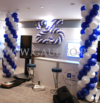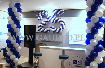 Kolumny z balonów wykonaliśmy przy stoisku promocyjnym dla firmy Via Medica. Stoisko przygotowane zostało do prezentacji oferty firmy w czasie konferencji diabetologicznej w hotelu Hilton w Warszawie. Taka dekoracja balonami pozwala doskonale wyróżnić się na tle innych stoisk. Na balonach użytych do dekoracji wykonaliśmy wcześniej nadruk okolicznościowy. Przy ułożeniu bocznym jest on słabo widoczny, jednak wprawne oczy klientów na pewno go zauważą. Dopełnieniem dekoracji była półtorametrowa liczba 25 zamontowana na plecach stoiska. Ta balonowa „25-tka” podkreśla dwadzieścia pięć lat działalności firmy, co jest już ładnym jubileuszem. Firmie Via Medica życzymy więc wszystkiego najlepszego z okazji jubileuszu, a wszystkich czytelników zapraszamy do skorzystania z naszej bogatej oferty dekoracji.